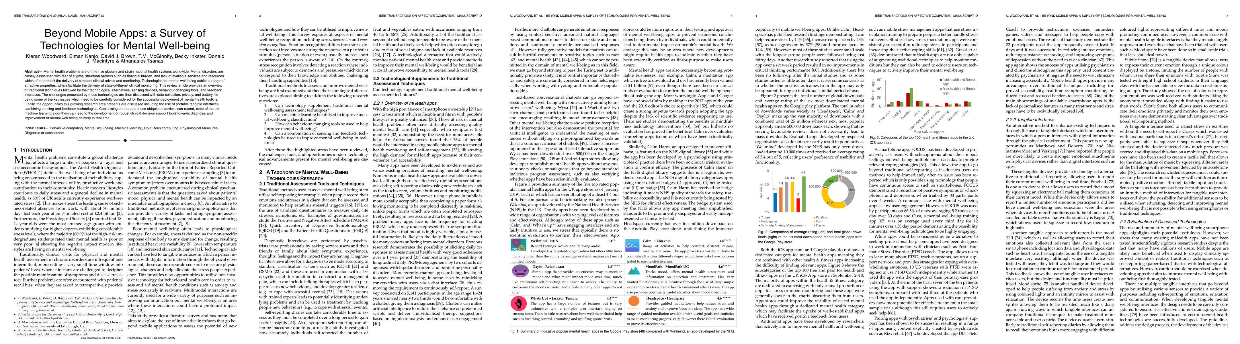 This paper surveys technologies for mental well-being, highlighting traditional methods and their technological alternatives, including sensing devices and feedback interfaces. It discusses challenges like data collection, privacy, and battery life, and explores opportunities for real-time clinical decision support using machine learning.