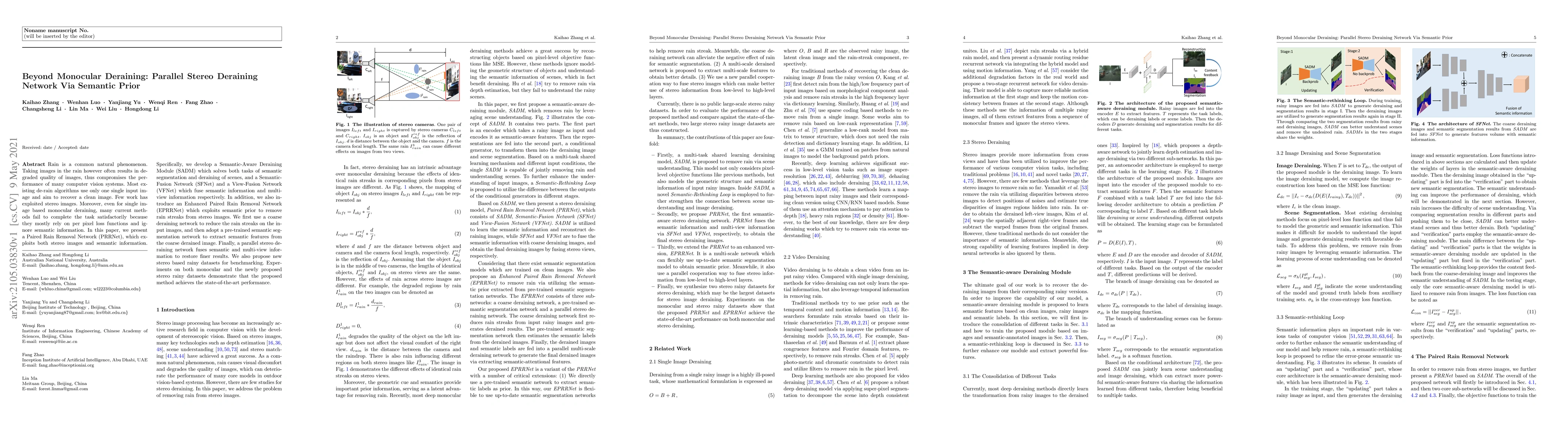 This paper introduces a Paired Rain Removal Network (PRRNet) that leverages stereo images and semantic information for deraining. It employs a Semantic-Aware Deraining Module, Semantic-Fusion Network, and View-Fusion Network to enhance deraining performance, achieving state-of-the-art results on both monocular and newly proposed stereo rainy datasets.