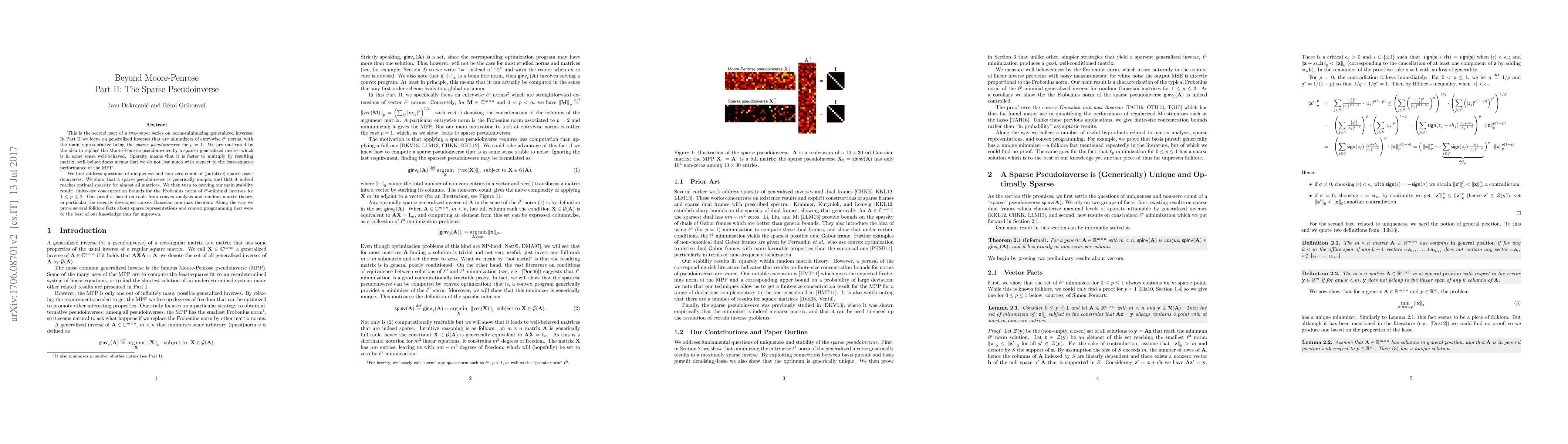 This paper explores generalized inverses that minimize entrywise p norms, focusing on the sparse pseudoinverse for $p = 1$. It demonstrates the uniqueness and optimal sparsity of sparse pseudoinverses and provides finite-size concentration bounds for their stability, leveraging tools from convex analysis and random matrix theory.