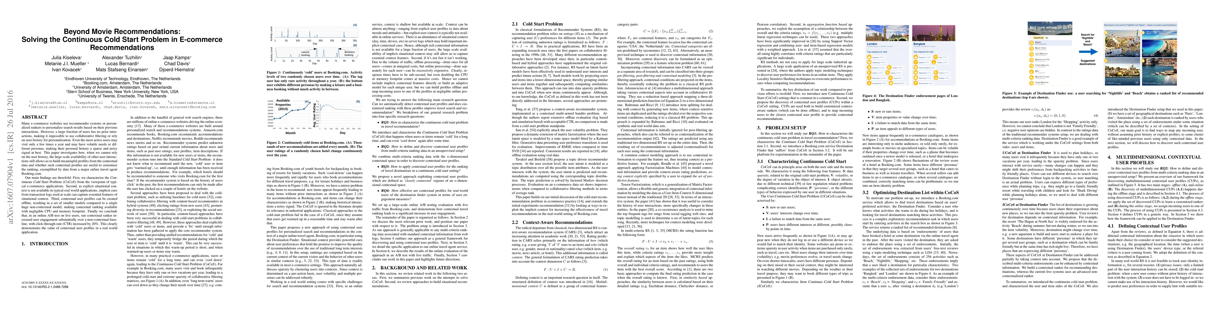 Many e-commerce websites use recommender systems or personalized rankers to personalize search results based on their previous interactions. However, a large fraction of users has no prior inter-actions, making it impossible to use collaborative filtering or rely on user history for personalization. Even the most active users mayvisit only a few times a year and may have volatile needs or different personas, making their personal history a sparse and noisy signal at best. This paper investigates how, when we cannot rely on the user history, the large scale availability of other user interactions still allows us to build meaningful profiles from the contextual data and whether such contextual profiles are useful to customize the ranking, exemplified by data from a major online travel agentBooking.com.Our main findings are threefold: First, we characterize the Continuous Cold Start Problem(CoCoS) from the viewpoint of typical e-commerce applications. Second, as explicit situational con-text is not available in typical real world applications, implicit cues from transaction logs used at scale can capture essential features of situational context. Third, contextual user profiles can be created offline, resulting in a set of smaller models compared to a single huge non-contextual model, making contextual ranking available with negligible CPU and memory footprint. Finally we conclude that, in an online A/B test on live users, our contextual ranker in-creased user engagement substantially over a non-contextual base-line, with click-through-rate (CTR) increased by 20%. This clearly demonstrates the value of contextual user profiles in a real world application.