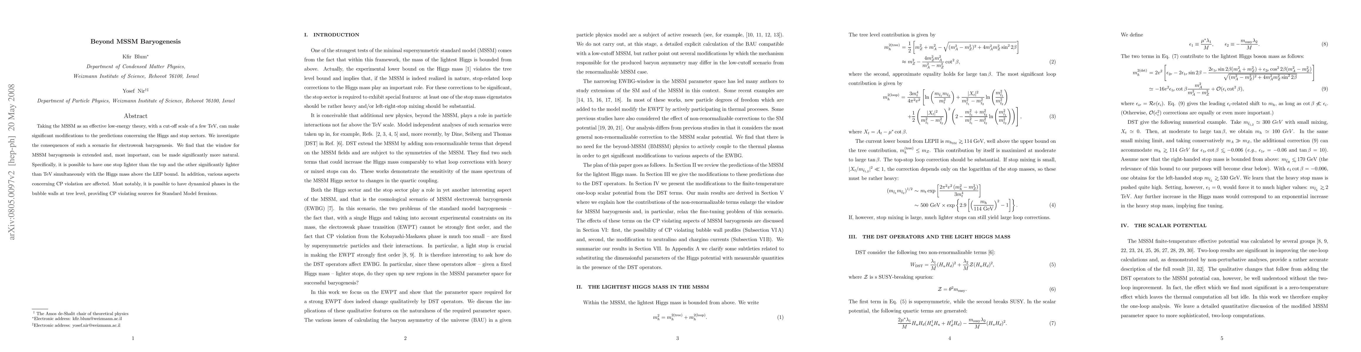 This paper explores the implications of an extended MSSM framework with a low-energy effective theory and a few TeV cut-off, finding that it extends the viable window for MSSM baryogenesis and makes it more natural. It also allows for lighter stop masses and impacts CP violation, potentially introducing dynamical phases in bubble walls.