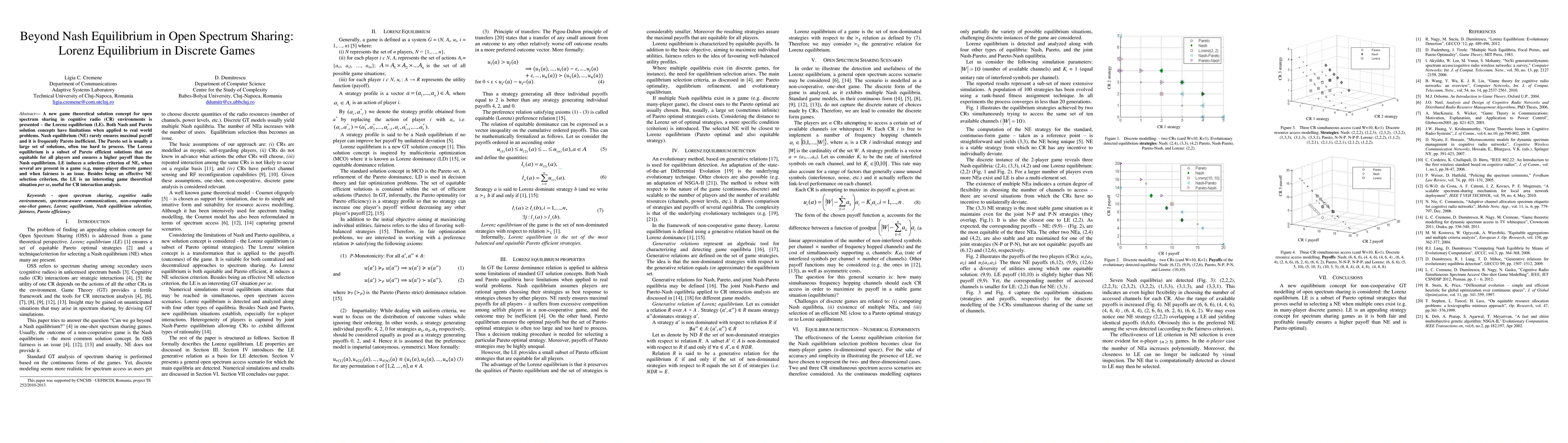 The paper introduces the Lorenz equilibrium (LE) as a new game theoretical solution for open spectrum sharing in cognitive radio environments, addressing the limitations of Nash and Pareto solutions. The LE is a subset of Pareto efficient solutions that ensures higher payoffs and fairness among players, serving as an effective criterion for selecting Nash equilibria in many-player discrete games.