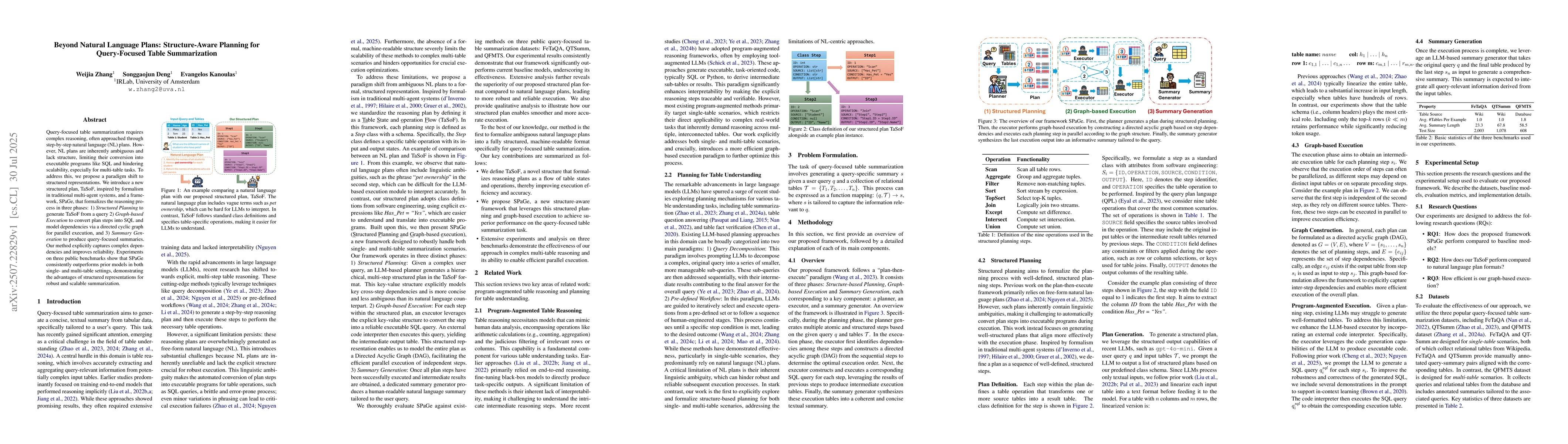 The paper distinguishes itself by shifting from ambiguous natural language plans to structured representations, improving reliability and scalability in query-focused table summarization.