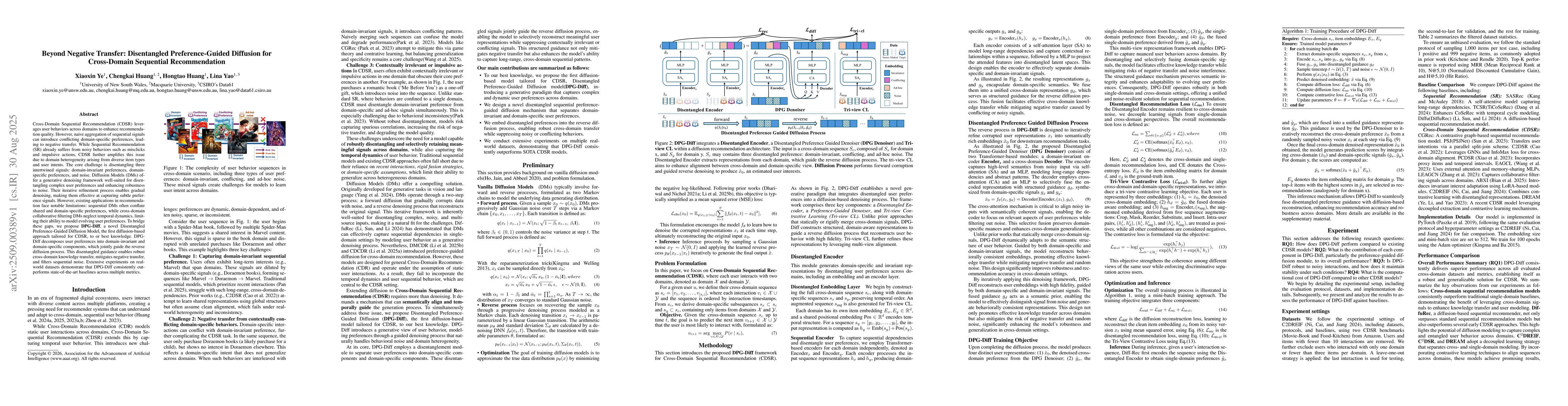 Cross-Domain Sequential Recommendation (CDSR) leverages user behaviors across domains to enhance recommendation quality. However, naive aggregation of sequential signals can introduce conflicting domain-specific preferences, leading to negative transfer. While Sequential Recommendation (SR) already suffers from noisy behaviors such as misclicks and impulsive actions, CDSR further amplifies this issue due to domain heterogeneity arising from diverse item types and user intents. The core challenge is disentangling three intertwined signals: domain-invariant preferences, domain-specific preferences, and noise. Diffusion Models (DMs) offer a generative denoising framework well-suited for disentangling complex user preferences and enhancing robustness to noise. Their iterative refinement process enables gradual denoising, making them effective at capturing subtle preference signals. However, existing applications in recommendation face notable limitations: sequential DMs often conflate shared and domain-specific preferences, while cross-domain collaborative filtering DMs neglect temporal dynamics, limiting their ability to model evolving user preferences. To bridge these gaps, we propose \textbf{DPG-Diff}, a novel Disentangled Preference-Guided Diffusion Model, the first diffusion-based approach tailored for CDSR, to or best knowledge. DPG-Diff decomposes user preferences into domain-invariant and domain-specific components, which jointly guide the reverse diffusion process. This disentangled guidance enables robust cross-domain knowledge transfer, mitigates negative transfer, and filters sequential noise. Extensive experiments on real-world datasets demonstrate that DPG-Diff consistently outperforms state-of-the-art baselines across multiple metrics.