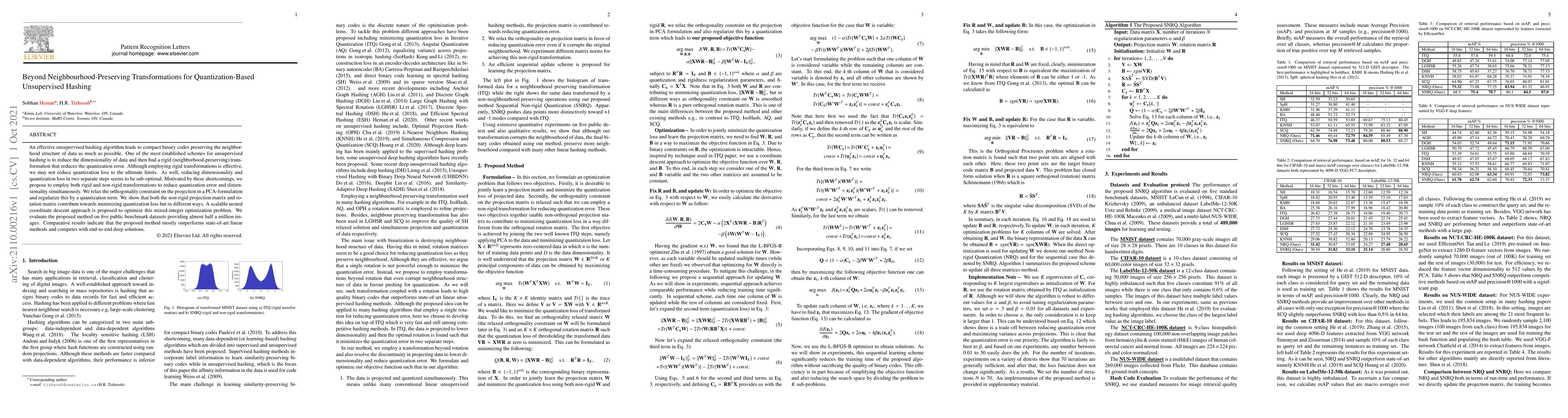 An effective unsupervised hashing algorithm leads to compact binary codes preserving the neighborhood structure of data as much as possible. One of the most established schemes for unsupervised hashing is to reduce the dimensionality of data and then find a rigid (neighbourhood-preserving) transformation that reduces the quantization error. Although employing rigid transformations is effective, we may not reduce quantization loss to the ultimate limits. As well, reducing dimensionality and quantization loss in two separate steps seems to be sub-optimal. Motivated by these shortcomings, we propose to employ both rigid and non-rigid transformations to reduce quantization error and dimensionality simultaneously. We relax the orthogonality constraint on the projection in a PCA-formulation and regularize this by a quantization term. We show that both the non-rigid projection matrix and rotation matrix contribute towards minimizing quantization loss but in different ways. A scalable nested coordinate descent approach is proposed to optimize this mixed-integer optimization problem. We evaluate the proposed method on five public benchmark datasets providing almost half a million images. Comparative results indicate that the proposed method mostly outperforms state-of-art linear methods and competes with end-to-end deep solutions.