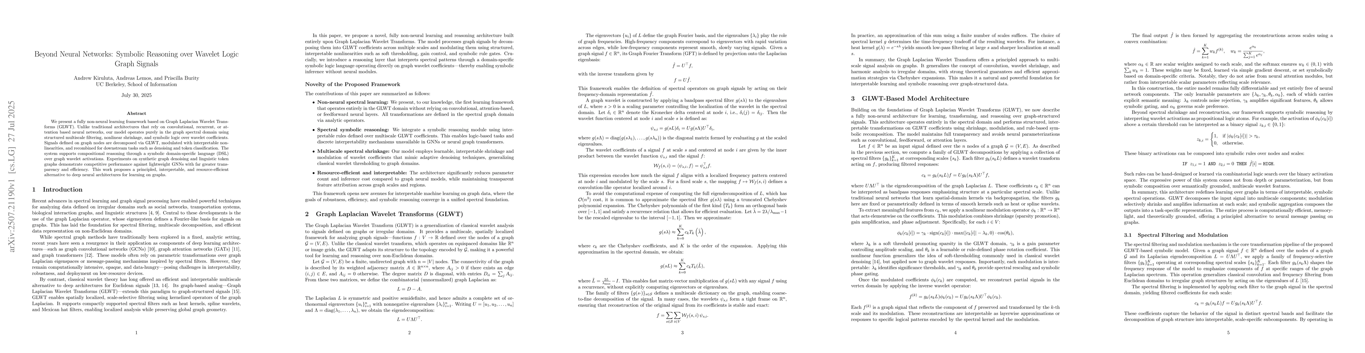 We present a fully non neural learning framework based on Graph Laplacian Wavelet Transforms (GLWT). Unlike traditional architectures that rely on convolutional, recurrent, or attention based neural networks, our model operates purely in the graph spectral domain using structured multiscale filtering, nonlinear shrinkage, and symbolic logic over wavelet coefficients. Signals defined on graph nodes are decomposed via GLWT, modulated with interpretable nonlinearities, and recombined for downstream tasks such as denoising and token classification. The system supports compositional reasoning through a symbolic domain-specific language (DSL) over graph wavelet activations. Experiments on synthetic graph denoising and linguistic token graphs demonstrate competitive performance against lightweight GNNs with far greater transparency and efficiency. This work proposes a principled, interpretable, and resource-efficient alternative to deep neural architectures for learning on graphs.