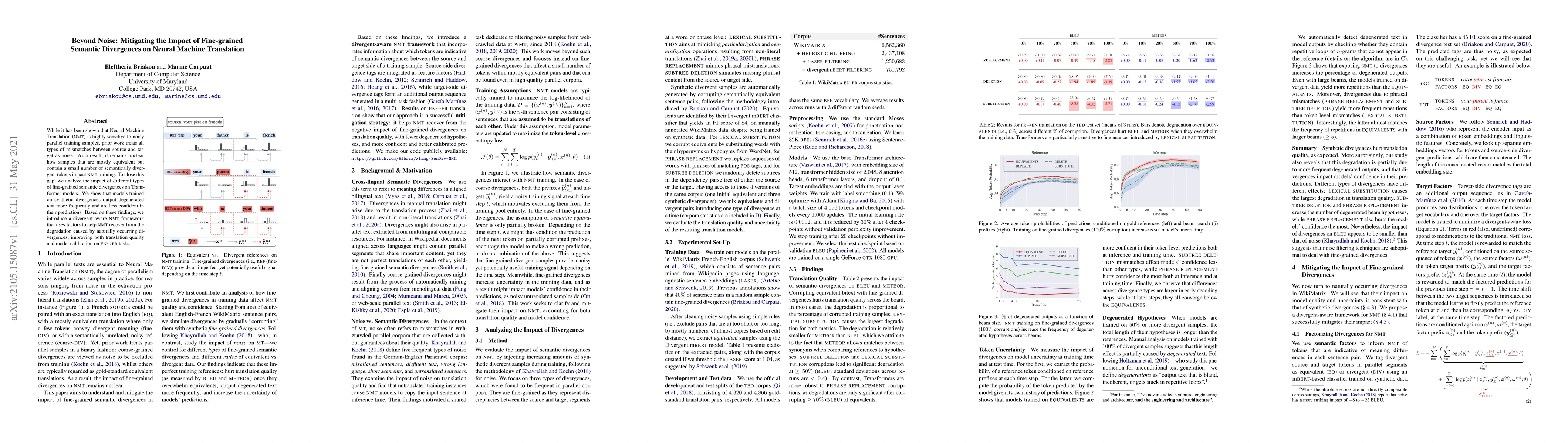 While it has been shown that Neural Machine Translation (NMT) is highly sensitive to noisy parallel training samples, prior work treats all types of mismatches between source and target as noise. As a result, it remains unclear how samples that are mostly equivalent but contain a small number of semantically divergent tokens impact NMT training. To close this gap, we analyze the impact of different types of fine-grained semantic divergences on Transformer models. We show that models trained on synthetic divergences output degenerated text more frequently and are less confident in their predictions. Based on these findings, we introduce a divergent-aware NMT framework that uses factors to help NMT recover from the degradation caused by naturally occurring divergences, improving both translation quality and model calibration on EN-FR tasks.