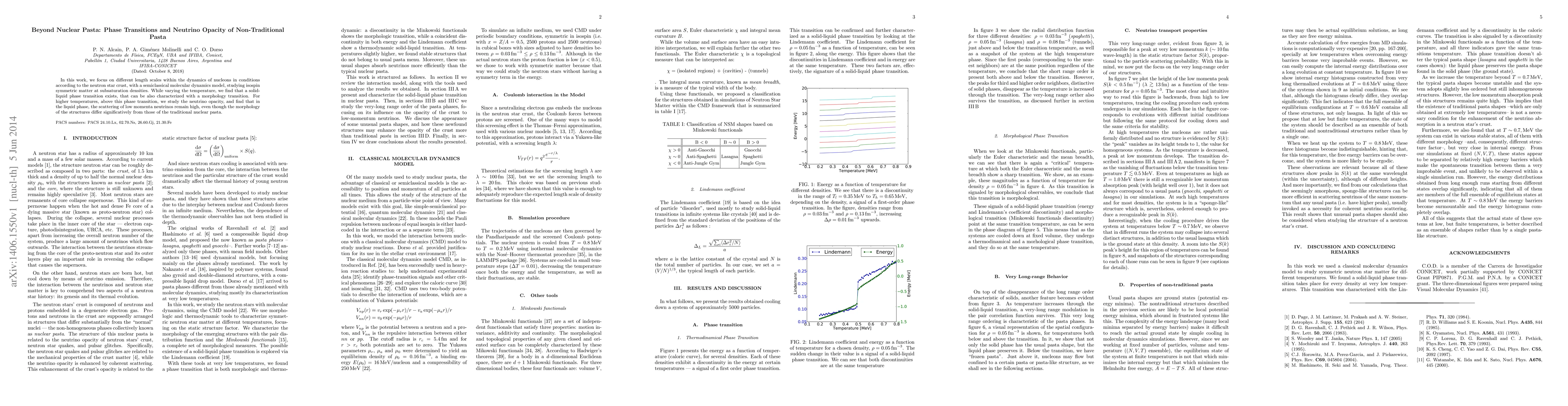 In this work, we focus on different length scales within the dynamics of nucleons in conditions according to the neutron star crust, with a semiclassical molecular dynamics model, studying isospin symmetric matter at subsaturation densities. While varying the temperature, we find that a solid-liquid phase transition exists, that can be also characterized with a morphology transition. For higher temperatures, above this phase transition, we study the neutrino opacity, and find that in the liquid phase, the scattering of low momenta neutrinos remain high, even though the morphology of the structures differ significatively from those of the traditional nuclear pasta.