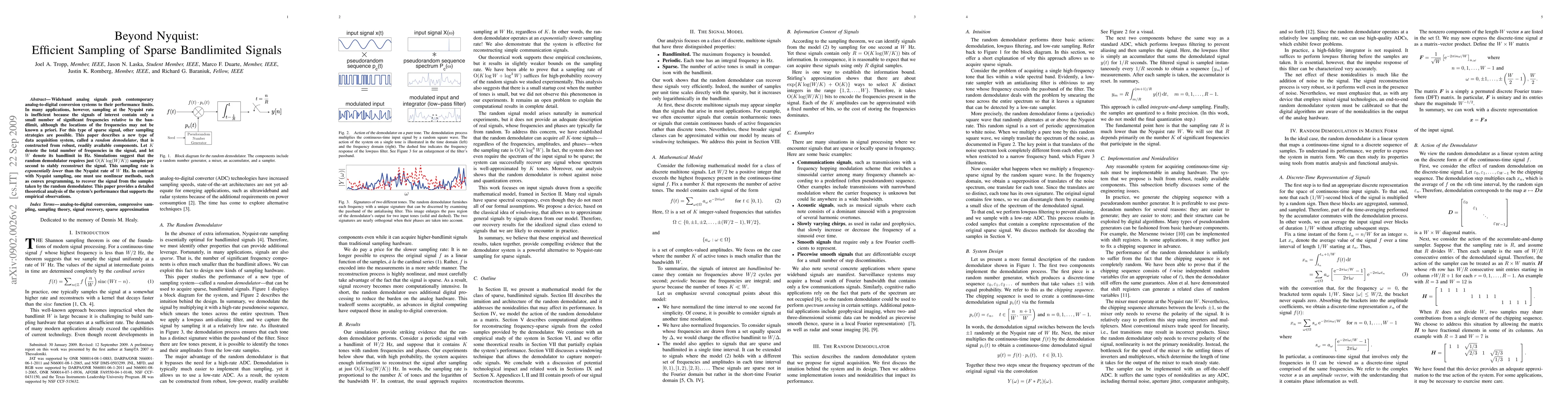 This paper introduces a novel random demodulator for efficiently sampling sparse bandlimited signals, requiring O(K log(W/K)) samples per second, significantly lower than the Nyquist rate. It employs nonlinear methods to reconstruct the signal and provides a theoretical analysis supporting its empirical effectiveness.