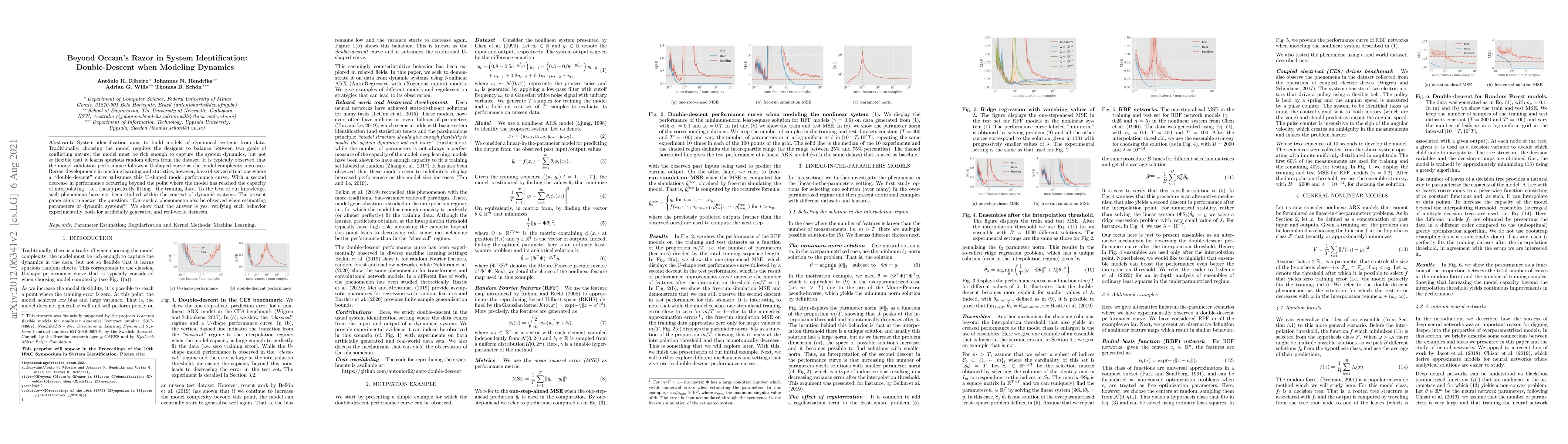 System identification aims to build models of dynamical systems from data. Traditionally, choosing the model requires the designer to balance between two goals of conflicting nature; the model must be rich enough to capture the system dynamics, but not so flexible that it learns spurious random effects from the dataset. It is typically observed that the model validation performance follows a U-shaped curve as the model complexity increases. Recent developments in machine learning and statistics, however, have observed situations where a "double-descent" curve subsumes this U-shaped model-performance curve. With a second decrease in performance occurring beyond the point where the model has reached the capacity of interpolating - i.e., (near) perfectly fitting - the training data. To the best of our knowledge, such phenomena have not been studied within the context of dynamic systems. The present paper aims to answer the question: "Can such a phenomenon also be observed when estimating parameters of dynamic systems?" We show that the answer is yes, verifying such behavior experimentally both for artificially generated and real-world datasets.