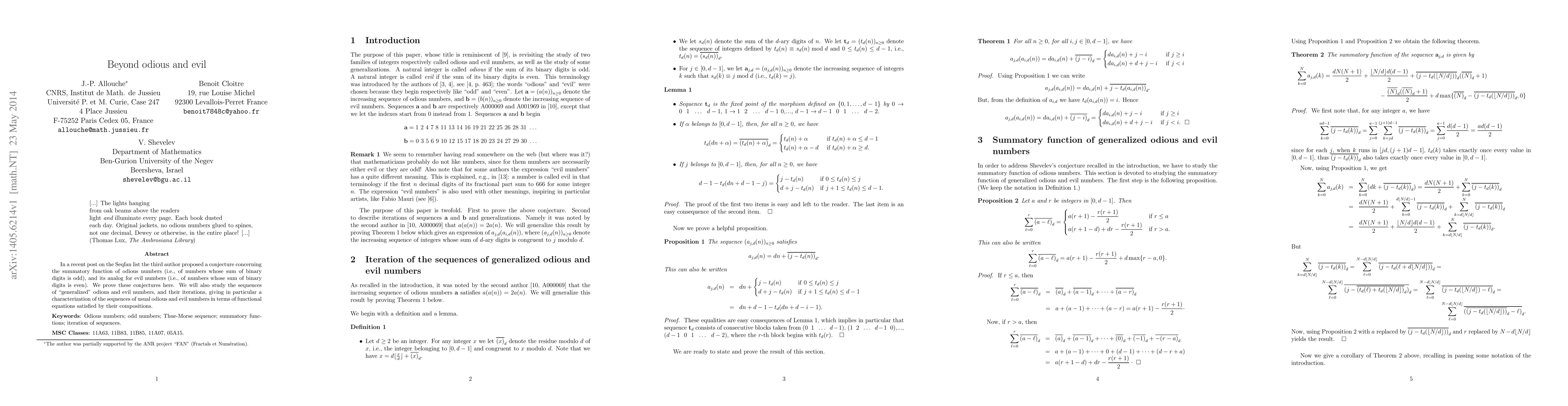 In a recent post on the Seqfan list the third author proposed a conjecture concerning the summatory function of odious numbers (i.e., of numbers whose sum of binary digits is odd), and its analog for evil numbers (i.e., of numbers whose sum of binary digits is even). We prove these conjectures here. We will also study the sequences of "generalized" odious and evil numbers, and their iterations, giving in particular a characterization of the sequences of usual odious and evil numbers in terms of functional equations satisfied by their compositions.