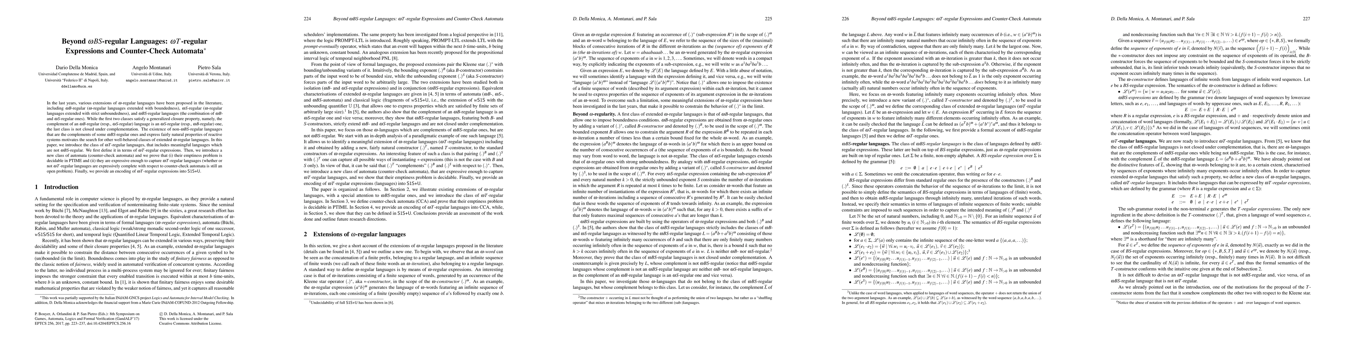 This paper introduces the class of $\omega$T-regular languages, extending beyond $\omega$BS-regular ones, and defines them via $\omega$T-regular expressions. It also presents counter-check automata, demonstrating decidability of their emptiness problem in PTIME and their expressive power to capture $\omega$T-regular languages.