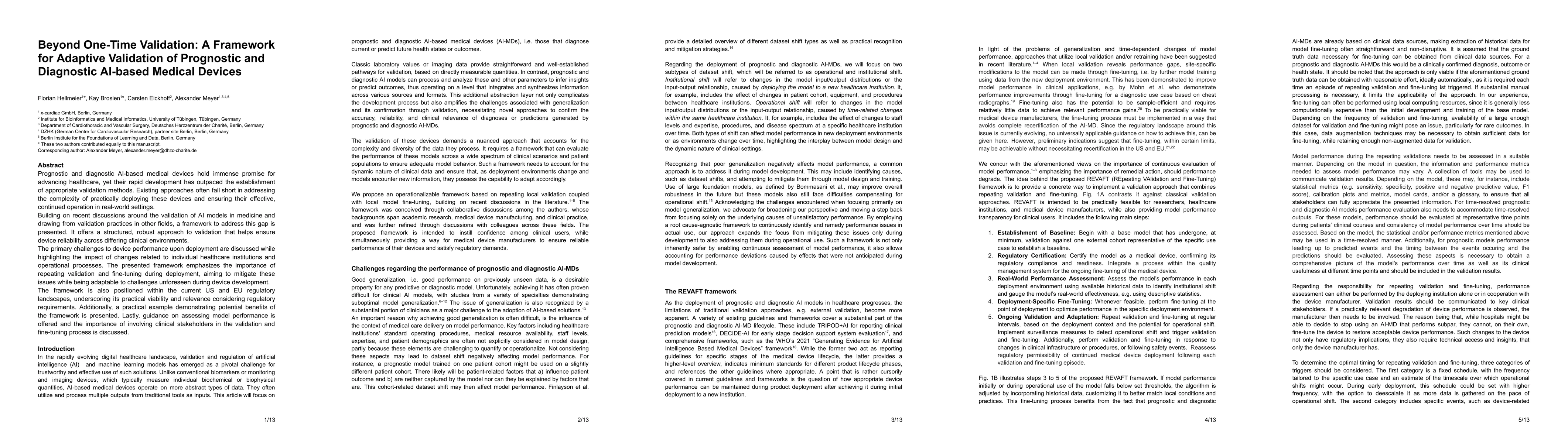 Prognostic and diagnostic AI-based medical devices hold immense promise for advancing healthcare, yet their rapid development has outpaced the establishment of appropriate validation methods. Existing approaches often fall short in addressing the complexity of practically deploying these devices and ensuring their effective, continued operation in real-world settings. Building on recent discussions around the validation of AI models in medicine and drawing from validation practices in other fields, a framework to address this gap is presented. It offers a structured, robust approach to validation that helps ensure device reliability across differing clinical environments. The primary challenges to device performance upon deployment are discussed while highlighting the impact of changes related to individual healthcare institutions and operational processes. The presented framework emphasizes the importance of repeating validation and fine-tuning during deployment, aiming to mitigate these issues while being adaptable to challenges unforeseen during device development. The framework is also positioned within the current US and EU regulatory landscapes, underscoring its practical viability and relevance considering regulatory requirements. Additionally, a practical example demonstrating potential benefits of the framework is presented. Lastly, guidance on assessing model performance is offered and the importance of involving clinical stakeholders in the validation and fine-tuning process is discussed.