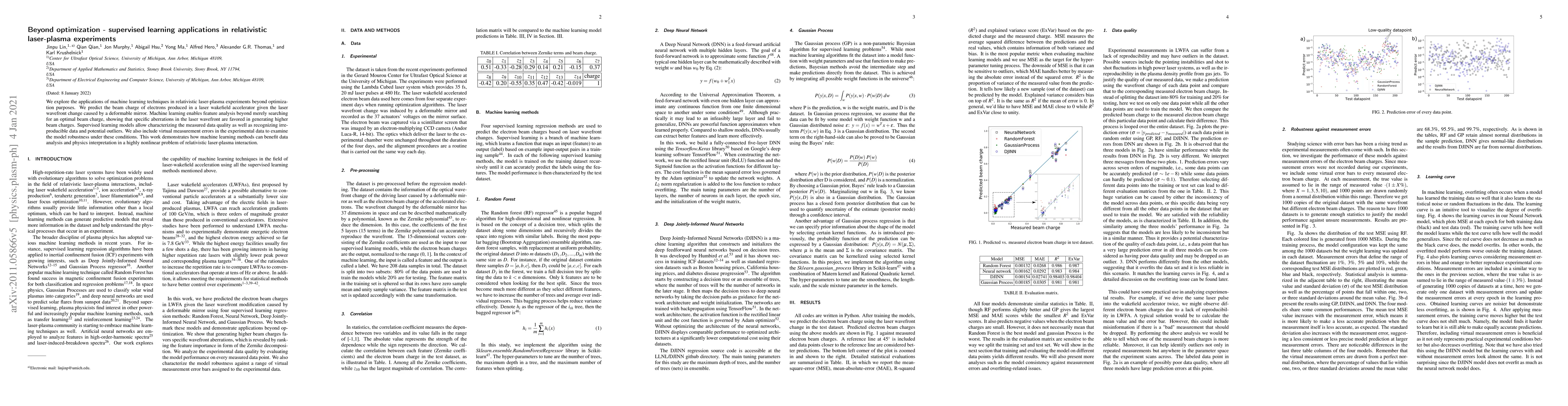 We explore the applications of machine learning techniques in relativistic laser-plasma experiments beyond optimization purposes. We predict the beam charge of electrons produced in a laser wakefield accelerator given the laser wavefront change caused by a deformable mirror. Machine learning enables feature analysis beyond merely searching for an optimal beam charge, showing that specific aberrations in the laser wavefront are favored in generating higher beam charges. Supervised learning models allow characterizing the measured data quality as well as recognizing irreproducible data and potential outliers. We also include virtual measurement errors in the experimental data to examine the model robustness under these conditions. This work demonstrates how machine learning methods can benefit data analysis and physics interpretation in a highly nonlinear problem of relativistic laser-plasma interaction.