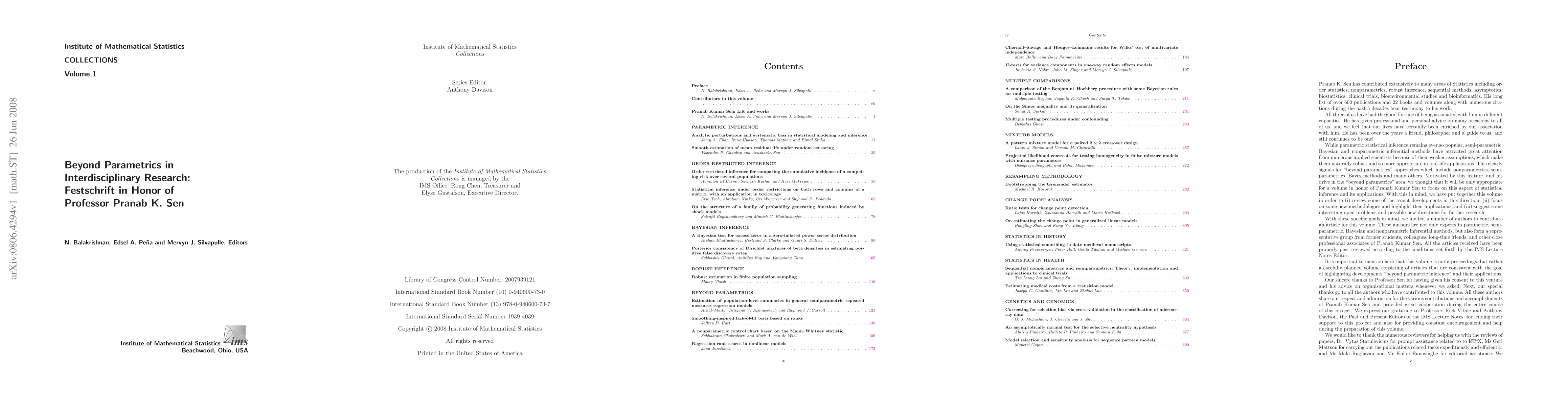 Pranab K. Sen has contributed extensively to many areas of Statistics including order statistics, nonparametrics, robust inference, sequential methods, asymptotics, biostatistics, clinical trials, bioenvironmental studies and bioinformatics. His long list of over 600 publications and 22 books and volumes along with numerous citations during the past 5 decades bear testimony to his work. All three of us have had the good fortune of being associated with him in different capacities. He has given professional and personal advice on many occasions to all of us, and we feel that our lives have certainly been enriched by our association with him. He has been over the years a friend, philosopher and a guide to us, and still continues to be one! While parametric statistical inference remains ever so popular, semi-parametric, Bayesian and nonparametric inferential methods have attracted great attention from numerous applied scientists because of their weaker assumptions, which make them naturally robust and so more appropriate in real-life applications. This clearly signals for ``beyond parametrics'' approaches which include nonparametrics, semi-parametrics, Bayes methods and many others. Motivated by this feature, and his drive in the ``beyond parametrics'' area, we thought that it will be only appropriate for a volume in honor of Pranab Kumar Sen to focus on this aspect of statistical inference and its applications. With this in mind, we have put together this volume in order to (i) review some of the recent developments in this direction, (ii) focus on some new methodologies and highlight their applications, and (iii) suggest some interesting open problems and possible new directions for further research.