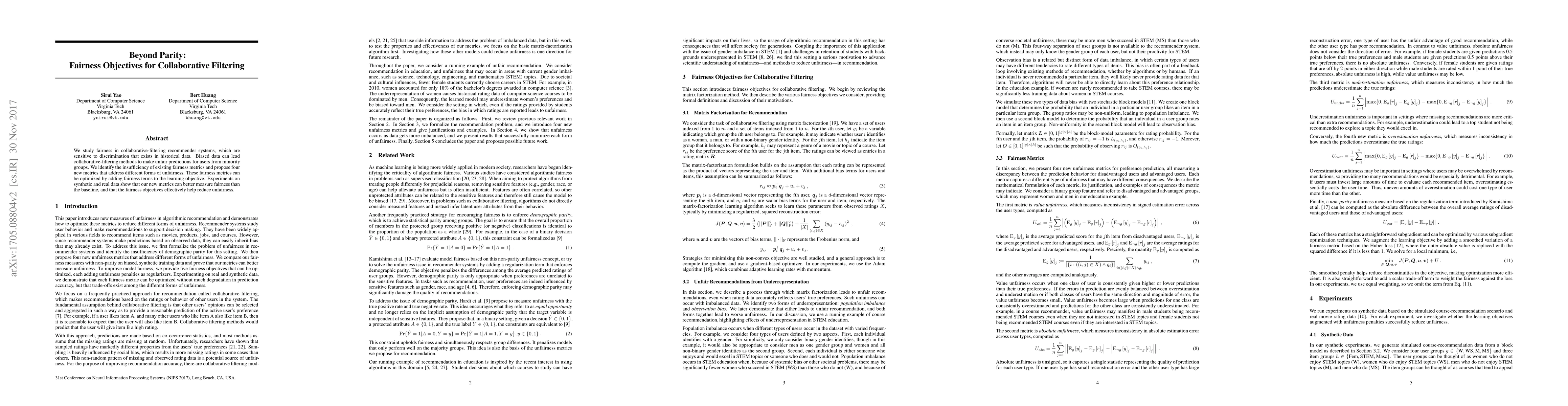 We study fairness in collaborative-filtering recommender systems, which are sensitive to discrimination that exists in historical data. Biased data can lead collaborative-filtering methods to make unfair predictions for users from minority groups. We identify the insufficiency of existing fairness metrics and propose four new metrics that address different forms of unfairness. These fairness metrics can be optimized by adding fairness terms to the learning objective. Experiments on synthetic and real data show that our new metrics can better measure fairness than the baseline, and that the fairness objectives effectively help reduce unfairness.