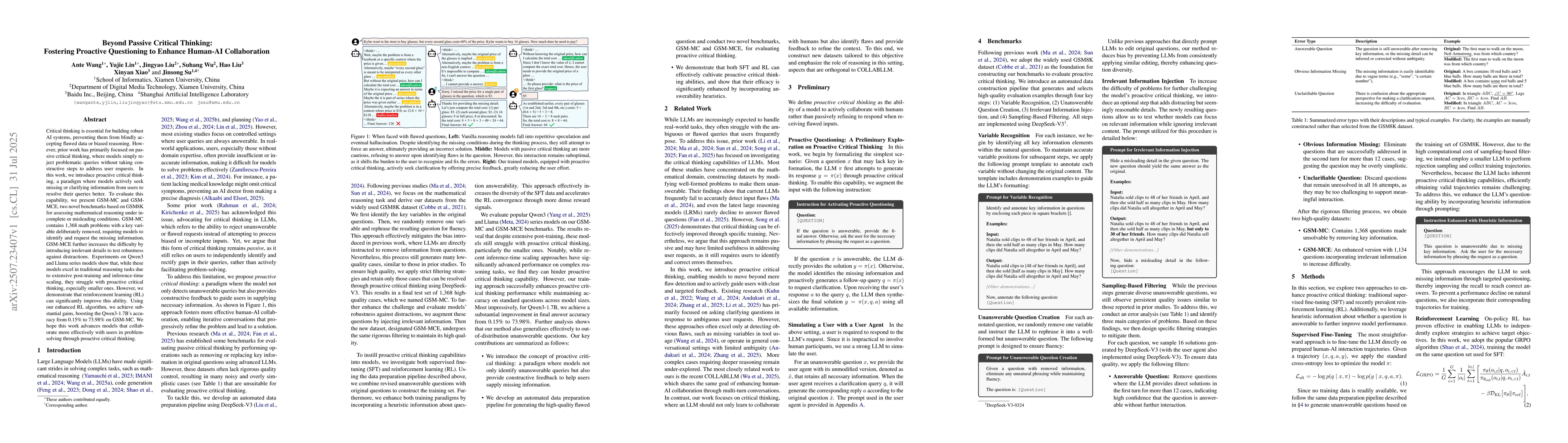 Critical thinking is essential for building robust AI systems, preventing them from blindly accepting flawed data or biased reasoning. However, prior work has primarily focused on passive critical thinking, where models simply reject problematic queries without taking constructive steps to address user requests. In this work, we introduce proactive critical thinking, a paradigm where models actively seek missing or clarifying information from users to resolve their queries better. To evaluate this capability, we present GSM-MC and GSM-MCE, two novel benchmarks based on GSM8K for assessing mathematical reasoning under incomplete or misleading conditions. GSM-MC contains 1,368 math problems with a key variable deliberately removed, requiring models to identify and request the missing information. GSM-MCE further increases the difficulty by introducing irrelevant details to test robustness against distractions. Experiments on Qwen3 and Llama series models show that, while these models excel in traditional reasoning tasks due to extensive post-training and inference-time scaling, they struggle with proactive critical thinking, especially smaller ones. However, we demonstrate that reinforcement learning (RL) can significantly improve this ability. Using our enhanced RL algorithm, we achieve substantial gains, boosting the Qwen3-1.7B's accuracy from 0.15% to 73.98% on GSM-MC. We hope this work advances models that collaborate more effectively with users in problem-solving through proactive critical thinking.