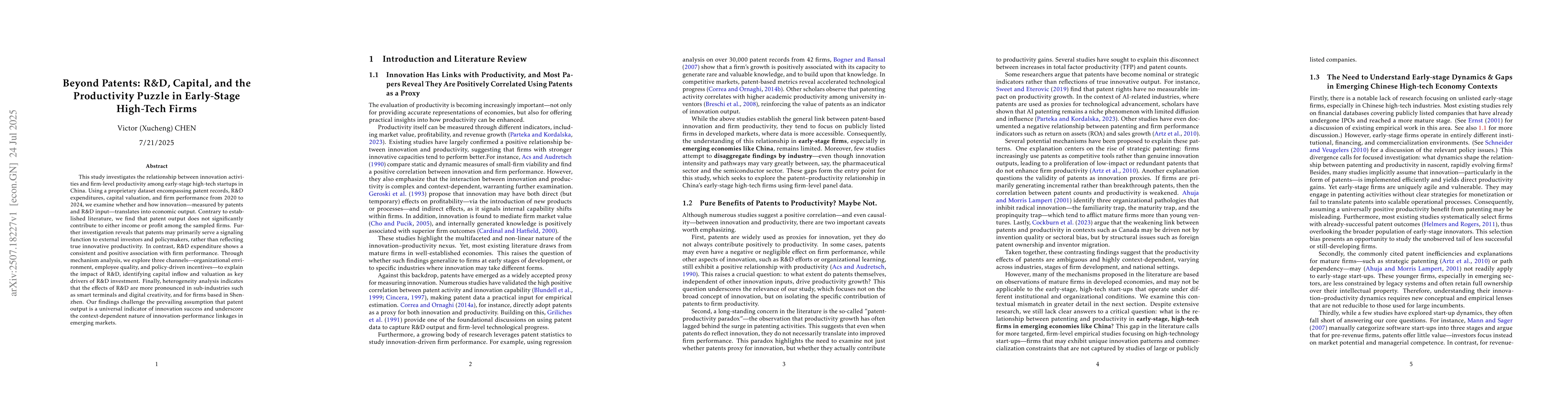This study investigates the relationship between innovation activities and firm-level productivity among early-stage high-tech startups in China. Using a proprietary dataset encompassing patent records, R&D expenditures, capital valuation, and firm performance from 2020 to 2024, we examine whether and how innovation, measured by patents and R&D input, translates into economic output. Contrary to established literature, we find that patent output does not significantly contribute to either income or profit among the sampled firms. Further investigation reveals that patents may primarily serve a signaling function to external investors and policymakers, rather than reflecting true innovative productivity. In contrast, R&D expenditure shows a consistent and positive association with firm performance. Through mechanism analysis, we explore three channels (organizational environment, employee quality, and policy-driven incentives) to explain the impact of R&D, identifying capital inflow and valuation as key drivers of R&D investment. Finally, heterogeneity analysis indicates that the effects of R&D are more pronounced in sub-industries such as smart terminals and digital creativity, and for firms based in Shenzhen. Our findings challenge the prevailing assumption that patent output is a universal indicator of innovation success and underscore the context-dependent nature of innovation-performance linkages in emerging markets.