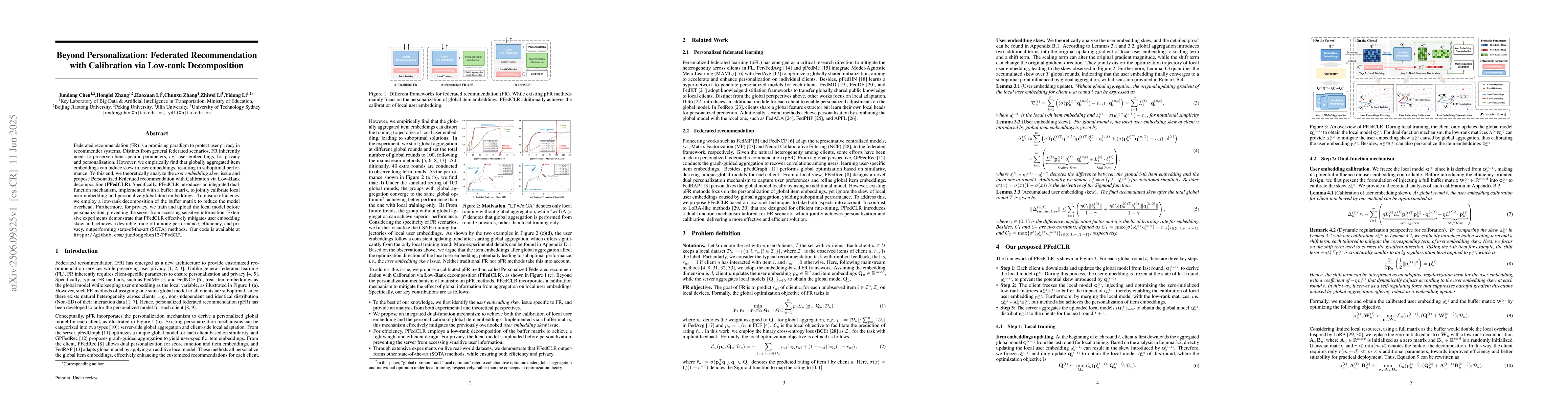 Federated recommendation (FR) is a promising paradigm to protect user privacy in recommender systems. Distinct from general federated scenarios, FR inherently needs to preserve client-specific parameters, i.e., user embeddings, for privacy and personalization. However, we empirically find that globally aggregated item embeddings can induce skew in user embeddings, resulting in suboptimal performance. To this end, we theoretically analyze the user embedding skew issue and propose Personalized Federated recommendation with Calibration via Low-Rank decomposition (PFedCLR). Specifically, PFedCLR introduces an integrated dual-function mechanism, implemented with a buffer matrix, to jointly calibrate local user embedding and personalize global item embeddings. To ensure efficiency, we employ a low-rank decomposition of the buffer matrix to reduce the model overhead. Furthermore, for privacy, we train and upload the local model before personalization, preventing the server from accessing sensitive information. Extensive experiments demonstrate that PFedCLR effectively mitigates user embedding skew and achieves a desirable trade-off among performance, efficiency, and privacy, outperforming state-of-the-art (SOTA) methods.