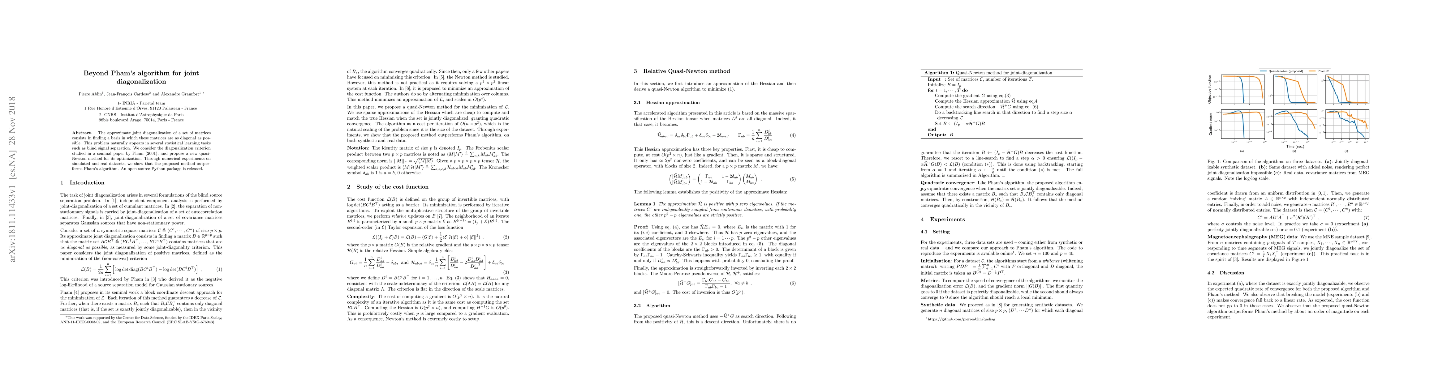 The approximate joint diagonalization of a set of matrices consists in finding a basis in which these matrices are as diagonal as possible. This problem naturally appears in several statistical learning tasks such as blind signal separation. We consider the diagonalization criterion studied in a seminal paper by Pham (2001), and propose a new quasi-Newton method for its optimization. Through numerical experiments on simulated and real datasets, we show that the proposed method outper-forms Pham's algorithm. An open source Python package is released.