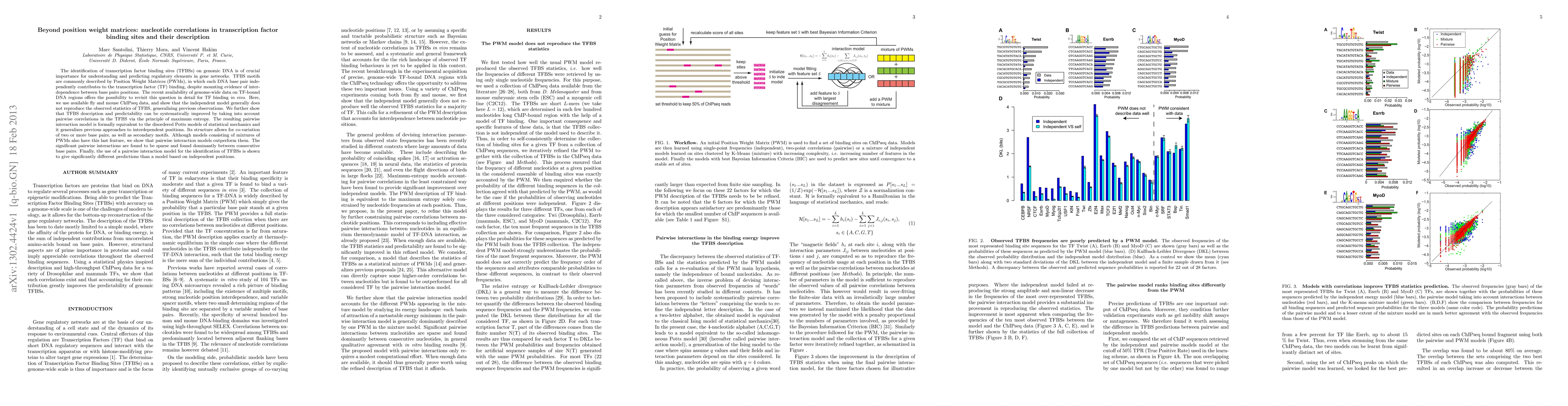 This paper investigates the limitations of Position Weight Matrices (PWMs) in describing transcription factor binding sites (TFBSs) by highlighting the interdependence between nucleotide positions. It proposes a pairwise interaction model that accounts for nucleotide correlations, significantly improving the description and predictability of TFBSs compared to traditional PWMs, and demonstrates its effectiveness using ChIP-seq data from flies and mice.
