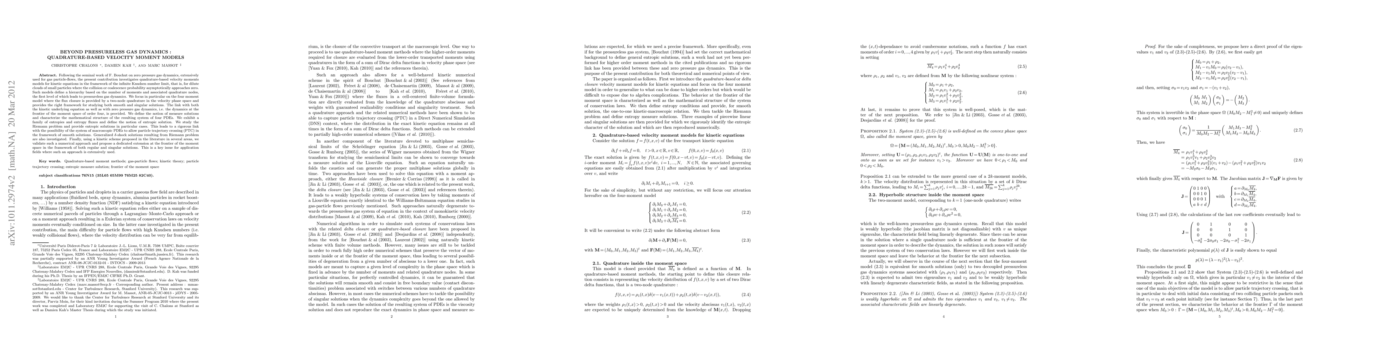 Following the seminal work of F. Bouchut on zero pressure gas dynamics which has been extensively used for gas particle-flows, the present contribution investigates quadrature-based velocity moments models for kinetic equations in the framework of the infinite Knudsen number limit, that is, for dilute clouds of small particles where the collision or coalescence probability asymptotically approaches zero. Such models define a hierarchy based on the number of moments and associated quadrature nodes, the first level of which leads to pressureless gas dynamics. We focus in particular on the four moment model where the flux closure is provided by a two-node quadrature in the velocity phase space and provide the right framework for studying both smooth and singular solutions. The link with both the kinetic underlying equation as well as with zero pressure gas dynamics is provided and we define the notion of measure solutions as well as the mathematical structure of the resulting system of four PDEs. We exhibit a family of entropies and entropy fluxes and define the notion of entropic solution. We study the Riemann problem and provide a series of entropic solutions in particular cases. This leads to a rigorous link with the possibility of the system of macroscopic PDEs to allow particle trajectory crossing (PTC) in the framework of smooth solutions. Generalized $\delta$-choc solutions resulting from Riemann problem are also investigated. Finally, using a kinetic scheme proposed in the literature without mathematical background in several areas, we validate such a numerical approach in the framework of both smooth and singular solutions.