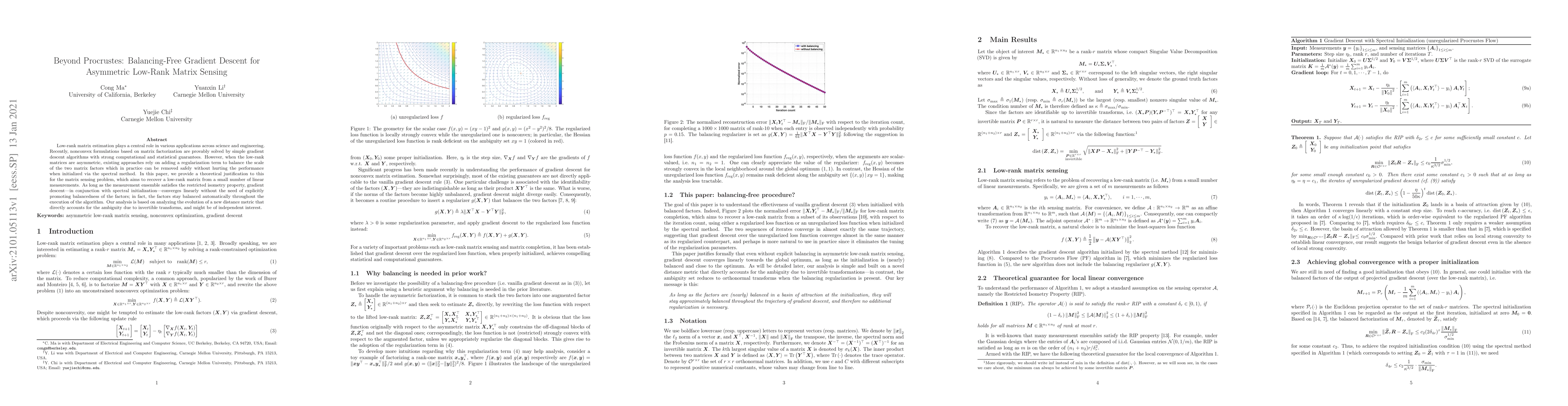 This paper proposes a gradient descent method for asymmetric low-rank matrix sensing that does not require balancing regularization, achieving linear convergence with spectral initialization. The method naturally maintains balanced factors without explicit promotion, based on a new distance metric that accounts for transform ambiguities.