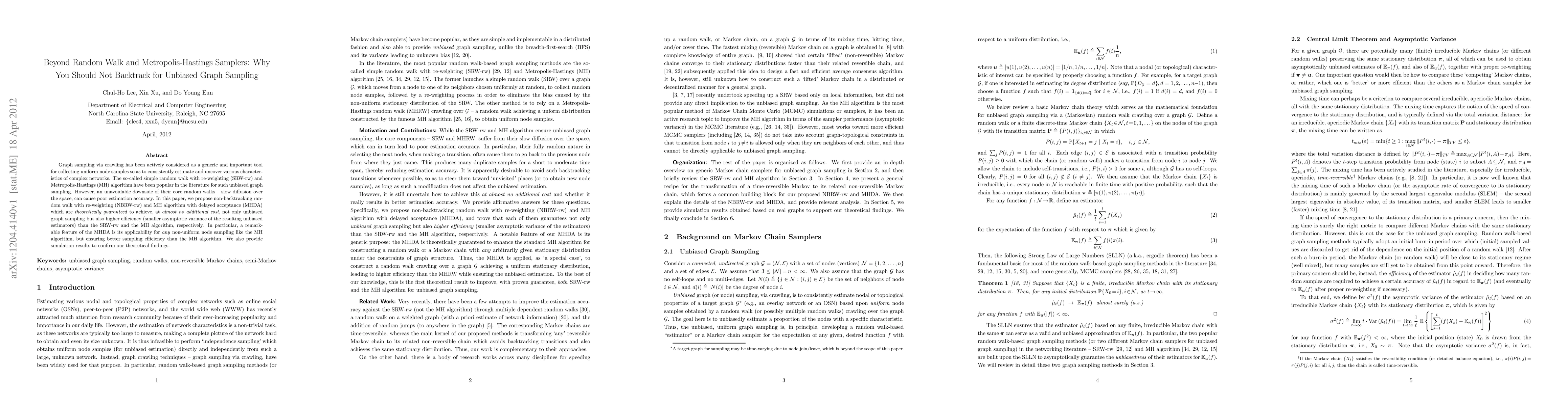 This paper proposes the non-backtracking random walk with re-weighting (NBRW-rw) and Metropolis-Hastings algorithm with delayed acceptance (MHDA) to improve unbiased graph sampling efficiency over traditional methods like simple random walk and Metropolis-Hastings, achieving higher accuracy with lower asymptotic variance.
