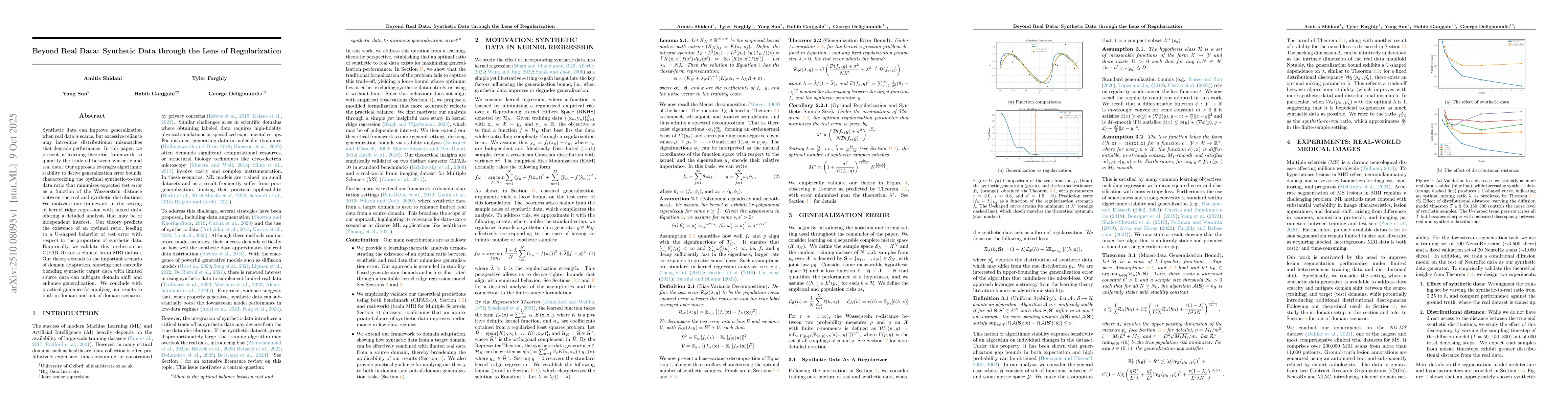 Synthetic data can improve generalization when real data is scarce, but excessive reliance may introduce distributional mismatches that degrade performance. In this paper, we present a learning-theoretic framework to quantify the trade-off between synthetic and real data. Our approach leverages algorithmic stability to derive generalization error bounds, characterizing the optimal synthetic-to-real data ratio that minimizes expected test error as a function of the Wasserstein distance between the real and synthetic distributions. We motivate our framework in the setting of kernel ridge regression with mixed data, offering a detailed analysis that may be of independent interest. Our theory predicts the existence of an optimal ratio, leading to a U-shaped behavior of test error with respect to the proportion of synthetic data. Empirically, we validate this prediction on CIFAR-10 and a clinical brain MRI dataset. Our theory extends to the important scenario of domain adaptation, showing that carefully blending synthetic target data with limited source data can mitigate domain shift and enhance generalization. We conclude with practical guidance for applying our results to both in-domain and out-of-domain scenarios.