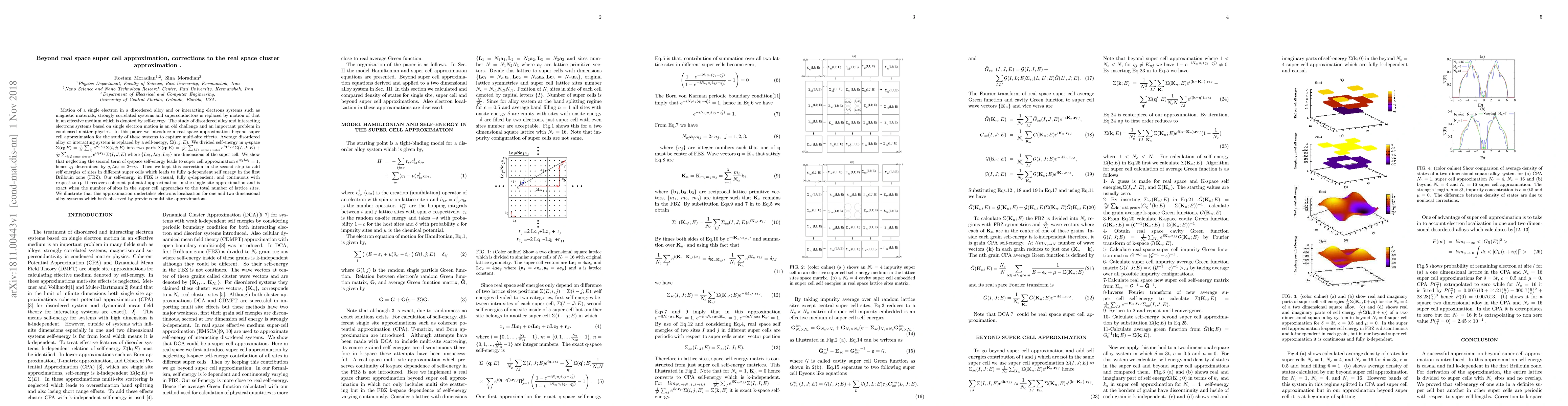 Motion of a single electron in a disordered alloy and or interacting electrons systems such as magnetic materials, strongly correlated systems and superconductors is replaced by motion of that in an effective medium which is denoted by self-energy. The study of disordered alloy and interacting electrons systems based on single electron motion is an old challenge and an important problem in condensed matter physics. In this paper we introduce a real space approximation beyond super cell approximation for the study of these systems to capture multi-site effects. Average disordered alloy or interacting system is replaced by a self-energy, $\Sigma(i,j,E)$. We divided self-energy in q-space $\Sigma({\bf q}; E)=\frac{1}{N}\sum_{ij}e^{i{\bf q}.{\bf r}_{ij}}\Sigma(i,j; E)$ into two parts $\Sigma({\bf q}; E)=\frac{1}{N_{c}}\sum_{IJ\in\; \mbox{\tiny same cluster}}e^{i{\bf q}.{\bf r}_{IJ}}\Sigma(I,J; E)+\frac{1}{N}\sum_{ij\notin \:\mbox{\tiny same cluster}}e^{i{\bf q}.{\bf r}_{IJ}}\Sigma(I,J,E)$ where $\{Lc_{1}, Lc_{2},Lc_{3}\}$ are dimensions of the super cell. We show that neglecting the second term of q-space self-energy leads to super cell approximation $e^{iq_{j} Lc_{j}}=1$, hence $ q_{j}$ determined by $ q_{j} Lc_{j}=2\pi n_{j}$. Then we kept this correction in the second step to add self energies of sites in different super cells which leads to fully q-dependent self energy in the first Brillouin zone (FBZ). Our self-energy in FBZ is casual, fully q-dependent, and continuous with respect to ${\bf q}$. It recovers coherent potential approximation in the single site approximation and is exact when the number of sites in the super cell approaches to the total number of lattice sites. We illustrate that this approximation undertakes electrons localization for one and two dimensional alloy systems which isn't observed by previous multi site approximations.