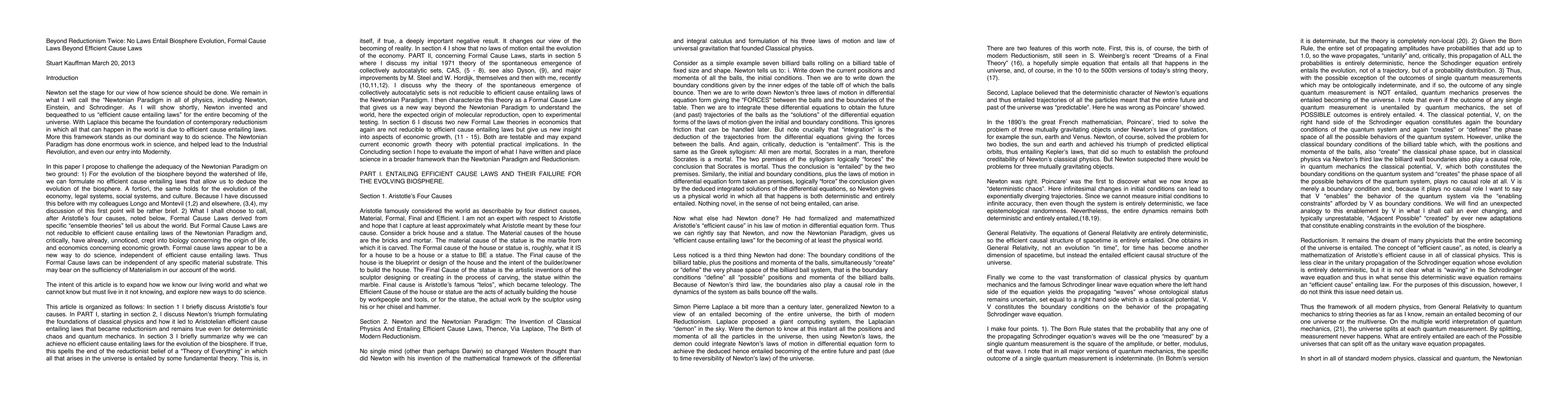 Newton set the stage for our view of how science should be done. We remain in what I will call the `Newtonian Paradigm' in all of physics, including Newton, Einstein, and Schrodinger. As I will show shortly, Newton invented and bequeathed to us `efficient cause entailing laws' for the entire becoming of the universe. With Laplace this became the foundation of contemporary reductionism in which all that can happen in the world is due to efficient cause entailing laws. More this framework stands as our dominant way to do science. The Newtonian Paradigm has done enormous work in science, and helped lead to the Industrial Revolution, and even our entry into Modernity. In this paper I propose to challenge the adequacy of the Newtonian Paradigm on two ground: 1) For the evolution of the biosphere beyond the watershed of life, we can formulate no efficient cause entailing laws that allow us to deduce the evolution of the biosphere. A fortiori, the same holds for the evolution of the economy, legal systems, social systems, and culture. Because I have discussed this before with my colleagues Longo and Montevil (1,2) and elsewhere, (3,4), my discussion of this first point will be rather brief. 2) What I shall choose to call, after Aristotle's four causes, noted below, Formal Cause Laws derived from specific `ensemble theories' tell us about the world. But Formal Cause Laws are not reducible to efficient cause entailing laws of the Newtonian Paradigm and, critically, have already, unnoticed, crept into biology concerning the origin of life, and economics concerning economic growth. Formal cause laws appear to be a new way to do science, independent of efficient cause entailing laws. Thus Formal Cause laws can be independent of any specific material substrate. This may bear on the sufficiency of Materialism in our account of the world.