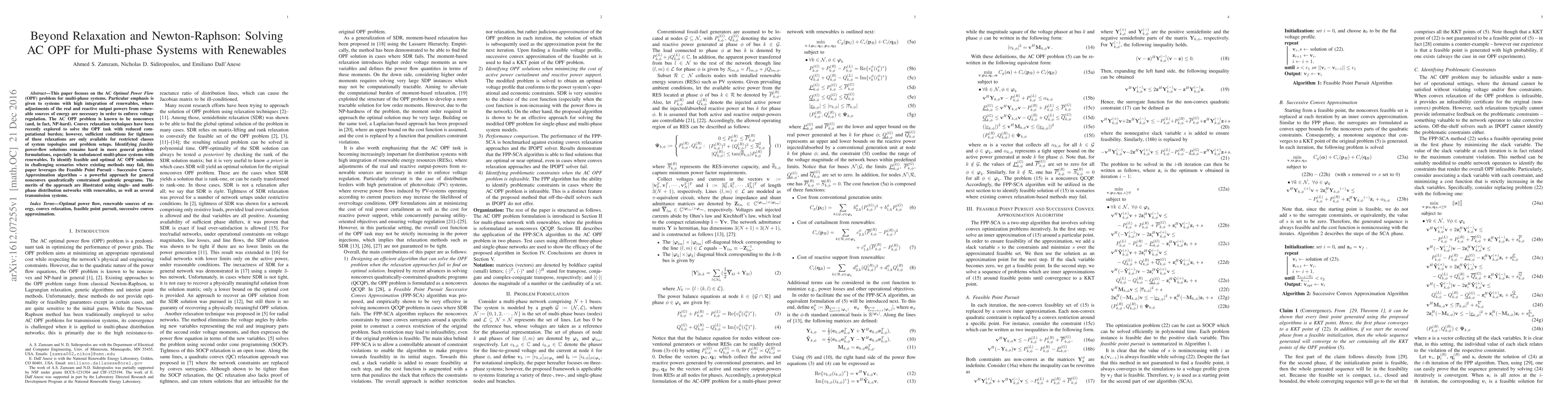 This paper focuses on the AC Optimal Power Flow (OPF) problem for multi-phase systems. Particular emphasis is given to systems with high integration of renewables, where adjustments of the real and reactive output powers from renewable sources of energy are necessary in order to enforce voltage regulation. The AC OPF problem is known to be nonconvex (and, in fact, NP-hard). Convex relaxation techniques have been recently explored to solve the OPF task with reduced computational burden; however, sufficient conditions for tightness of these relaxations are only available for restricted classes of system topologies and problem setups. Identifying feasible power-flow solutions remains hard in more general problem formulations, especially in unbalanced multi-phase systems with renewables. To identify feasible and optimal AC OPF solutions in challenging scenarios where existing methods may fail, this paper leverages the Feasible Point Pursuit - Successive Convex Approximation algorithm -- a powerful approach for general nonconvex quadratically constrained quadratic programs. The merits of the approach are illustrated using single- and multi-phase distribution networks with renewables, as well as several transmission systems.
