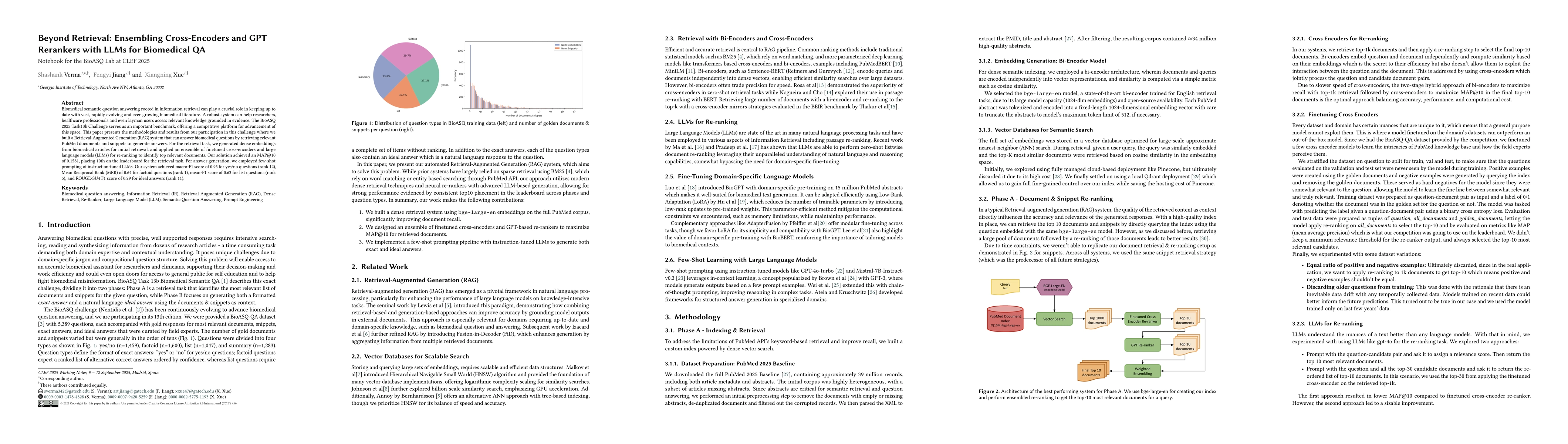Biomedical semantic question answering rooted in information retrieval can play a crucial role in keeping up to date with vast, rapidly evolving and ever-growing biomedical literature. A robust system can help researchers, healthcare professionals and even layman users access relevant knowledge grounded in evidence. The BioASQ 2025 Task13b Challenge serves as an important benchmark, offering a competitive platform for advancement of this space. This paper presents the methodologies and results from our participation in this challenge where we built a Retrieval-Augmented Generation (RAG) system that can answer biomedical questions by retrieving relevant PubMed documents and snippets to generate answers. For the retrieval task, we generated dense embeddings from biomedical articles for initial retrieval, and applied an ensemble of finetuned cross-encoders and large language models (LLMs) for re-ranking to identify top relevant documents. Our solution achieved an MAP@10 of 0.1581, placing 10th on the leaderboard for the retrieval task. For answer generation, we employed few-shot prompting of instruction-tuned LLMs. Our system achieved macro-F1 score of 0.95 for yes/no questions (rank 12), Mean Reciprocal Rank (MRR) of 0.64 for factoid questions (rank 1), mean-F1 score of 0.63 for list questions (rank 5), and ROUGE-SU4 F1 score of 0.29 for ideal answers (rank 11).