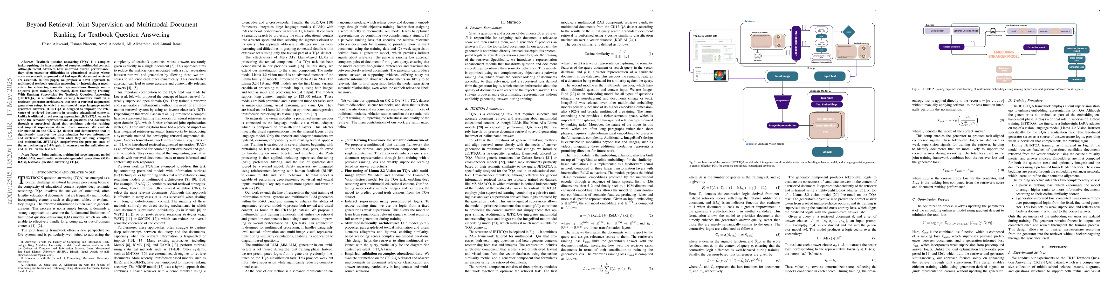 Textbook question answering (TQA) is a complex task, requiring the interpretation of complex multimodal context. Although recent advances have improved overall performance, they often encounter difficulties in educational settings where accurate semantic alignment and task-specific document retrieval are essential. In this paper, we propose a novel approach to multimodal textbook question answering by introducing a mechanism for enhancing semantic representations through multi-objective joint training. Our model, Joint Embedding Training With Ranking Supervision for Textbook Question Answering (JETRTQA), is a multimodal learning framework built on a retriever--generator architecture that uses a retrieval-augmented generation setup, in which a multimodal large language model generates answers. JETRTQA is designed to improve the relevance of retrieved documents in complex educational contexts. Unlike traditional direct scoring approaches, JETRTQA learns to refine the semantic representations of questions and documents through a supervised signal that combines pairwise ranking and implicit supervision derived from answers. We evaluate our method on the CK12-QA dataset and demonstrate that it significantly improves the discrimination between informative and irrelevant documents, even when they are long, complex, and multimodal. JETRTQA outperforms the previous state of the art, achieving a 2.4\% gain in accuracy on the validation set and 11.1\% on the test set.