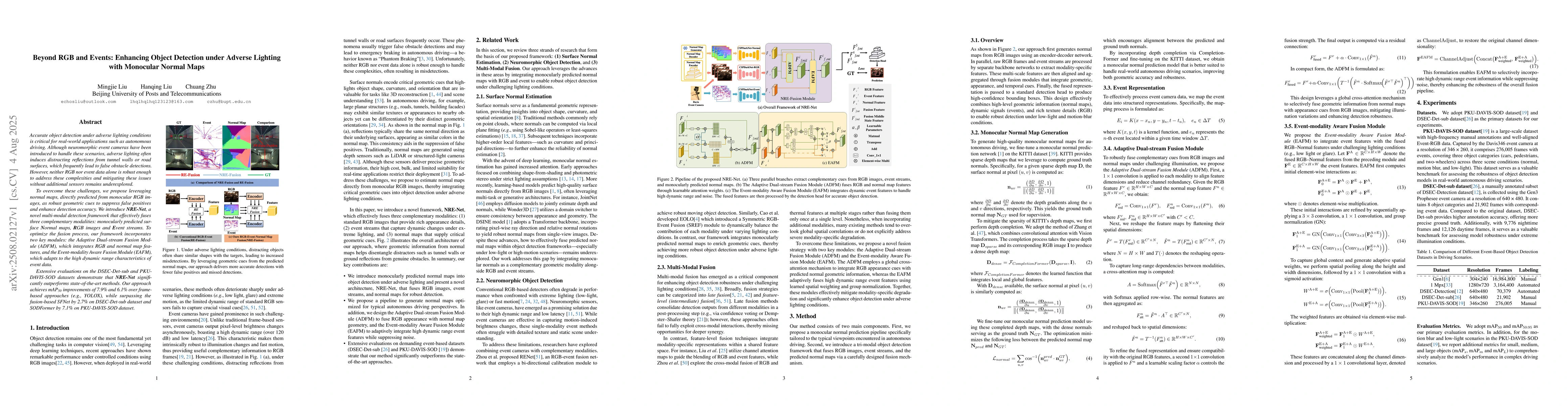 Accurate object detection under adverse lighting conditions is critical for real-world applications such as autonomous driving. Although neuromorphic event cameras have been introduced to handle these scenarios, adverse lighting often induces distracting reflections from tunnel walls or road surfaces, which frequently lead to false obstacle detections. However, neither RGB nor event data alone is robust enough to address these complexities, and mitigating these issues without additional sensors remains underexplored. To overcome these challenges, we propose leveraging normal maps, directly predicted from monocular RGB images, as robust geometric cues to suppress false positives and enhance detection accuracy. We introduce NRE-Net, a novel multi-modal detection framework that effectively fuses three complementary modalities: monocularly predicted surface normal maps, RGB images, and event streams. To optimize the fusion process, our framework incorporates two key modules: the Adaptive Dual-stream Fusion Module (ADFM), which integrates RGB and normal map features, and the Event-modality Aware Fusion Module (EAFM), which adapts to the high dynamic range characteristics of event data. Extensive evaluations on the DSEC-Det-sub and PKU-DAVIS-SOD datasets demonstrate that NRE-Net significantly outperforms state-of-the-art methods. Our approach achieves mAP50 improvements of 7.9% and 6.1% over frame-based approaches (e.g., YOLOX), while surpassing the fusion-based SFNet by 2.7% on the DSEC-Det-sub dataset and SODFormer by 7.1% on the PKU-DAVIS-SOD dataset.