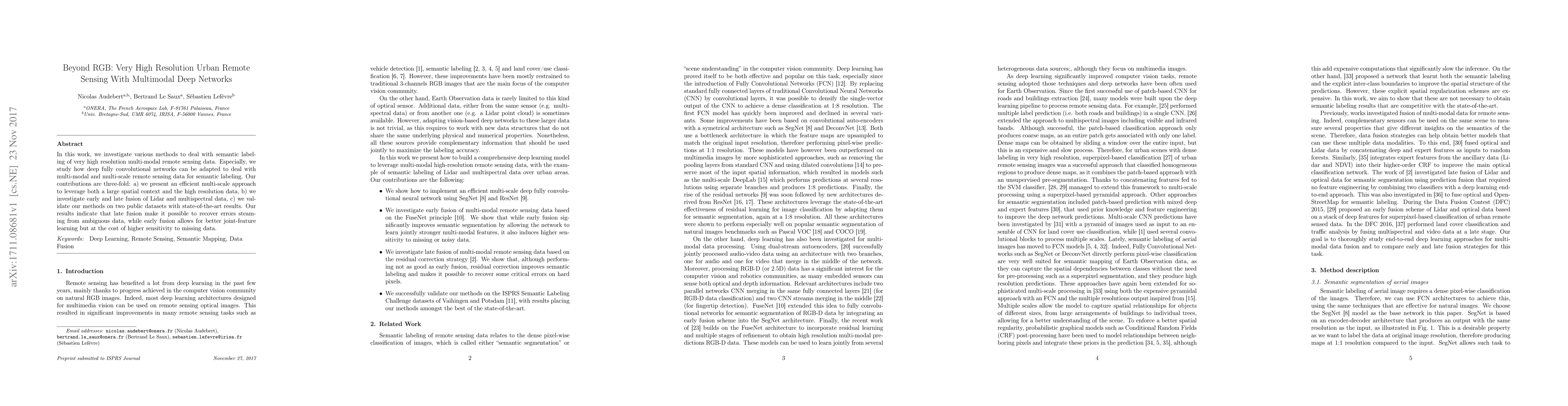 This paper explores deep fully convolutional networks for semantic labeling of high-resolution multi-modal remote sensing data, presenting a multi-scale approach for effective context and resolution use. It evaluates early and late fusion of Lidar and multispectral data, achieving state-of-the-art results and showing that late fusion corrects ambiguous data errors while early fusion enhances joint-feature learning but is more sensitive to missing data.