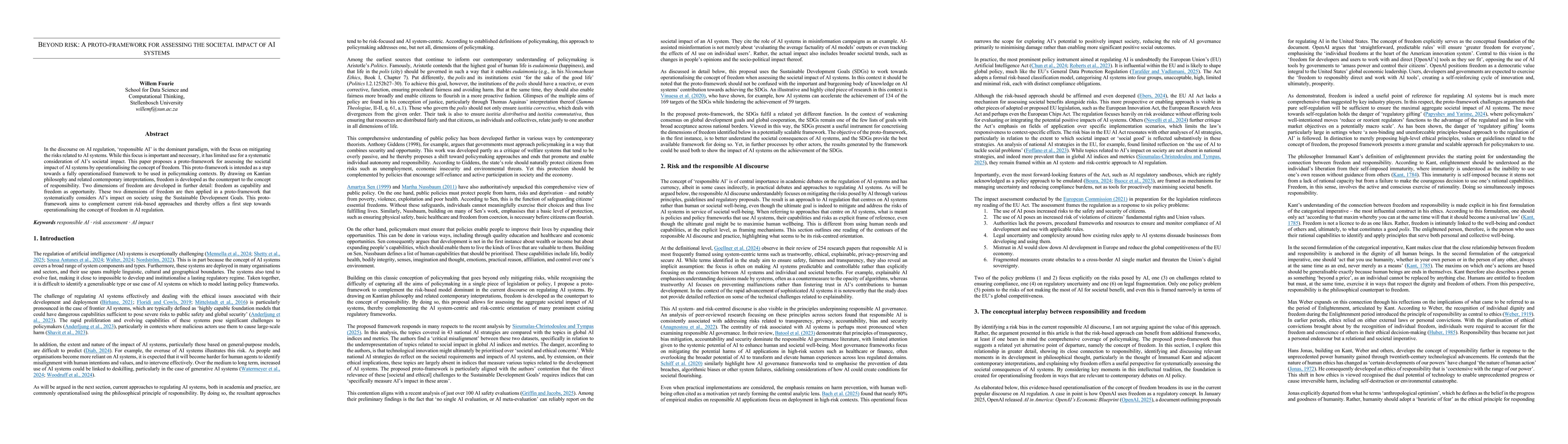 In the discourse on AI regulation, 'responsible AI' is the dominant paradigm, with the focus on mitigating the risks related to AI systems. While this focus is important and necessary, it has limited use for a systematic consideration of AI's societal impact. This paper proposes a proto-framework for assessing the societal impact of AI systems by operationalising the concept of freedom. This proto-framework is intended as a step towards a fully operationalised framework to be used in policymaking contexts. By drawing on Kantian philosophy and related contemporary interpretations, freedom is developed as the counterpart to the concept of responsibility. Two dimensions of freedom are developed in further detail: freedom as capability and freedom as opportunity. These two dimensions of freedom are then applied in a proto-framework that systematically considers AI's impact on society using the Sustainable Development Goals. This proto-framework aims to complement current risk-based approaches and thereby offers a first step towards operationalising the concept of freedom in AI regulation.