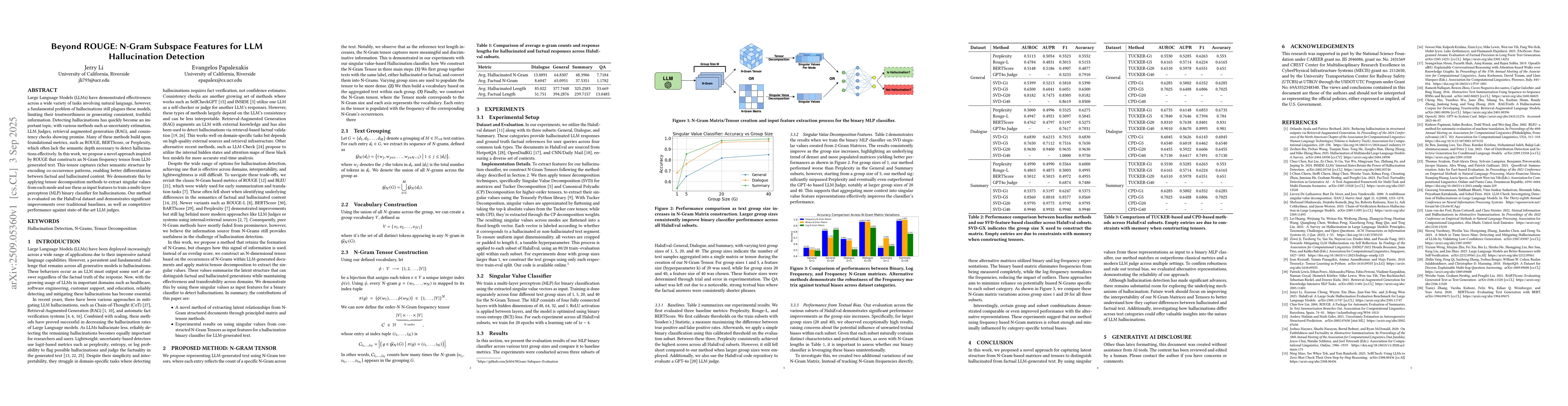 Large Language Models (LLMs) have demonstrated effectiveness across a wide variety of tasks involving natural language, however, a fundamental problem of hallucinations still plagues these models, limiting their trustworthiness in generating consistent, truthful information. Detecting hallucinations has quickly become an important topic, with various methods such as uncertainty estimation, LLM Judges, retrieval augmented generation (RAG), and consistency checks showing promise. Many of these methods build upon foundational metrics, such as ROUGE, BERTScore, or Perplexity, which often lack the semantic depth necessary to detect hallucinations effectively. In this work, we propose a novel approach inspired by ROUGE that constructs an N-Gram frequency tensor from LLM-generated text. This tensor captures richer semantic structure by encoding co-occurrence patterns, enabling better differentiation between factual and hallucinated content. We demonstrate this by applying tensor decomposition methods to extract singular values from each mode and use these as input features to train a multi-layer perceptron (MLP) binary classifier for hallucinations. Our method is evaluated on the HaluEval dataset and demonstrates significant improvements over traditional baselines, as well as competitive performance against state-of-the-art LLM judges.