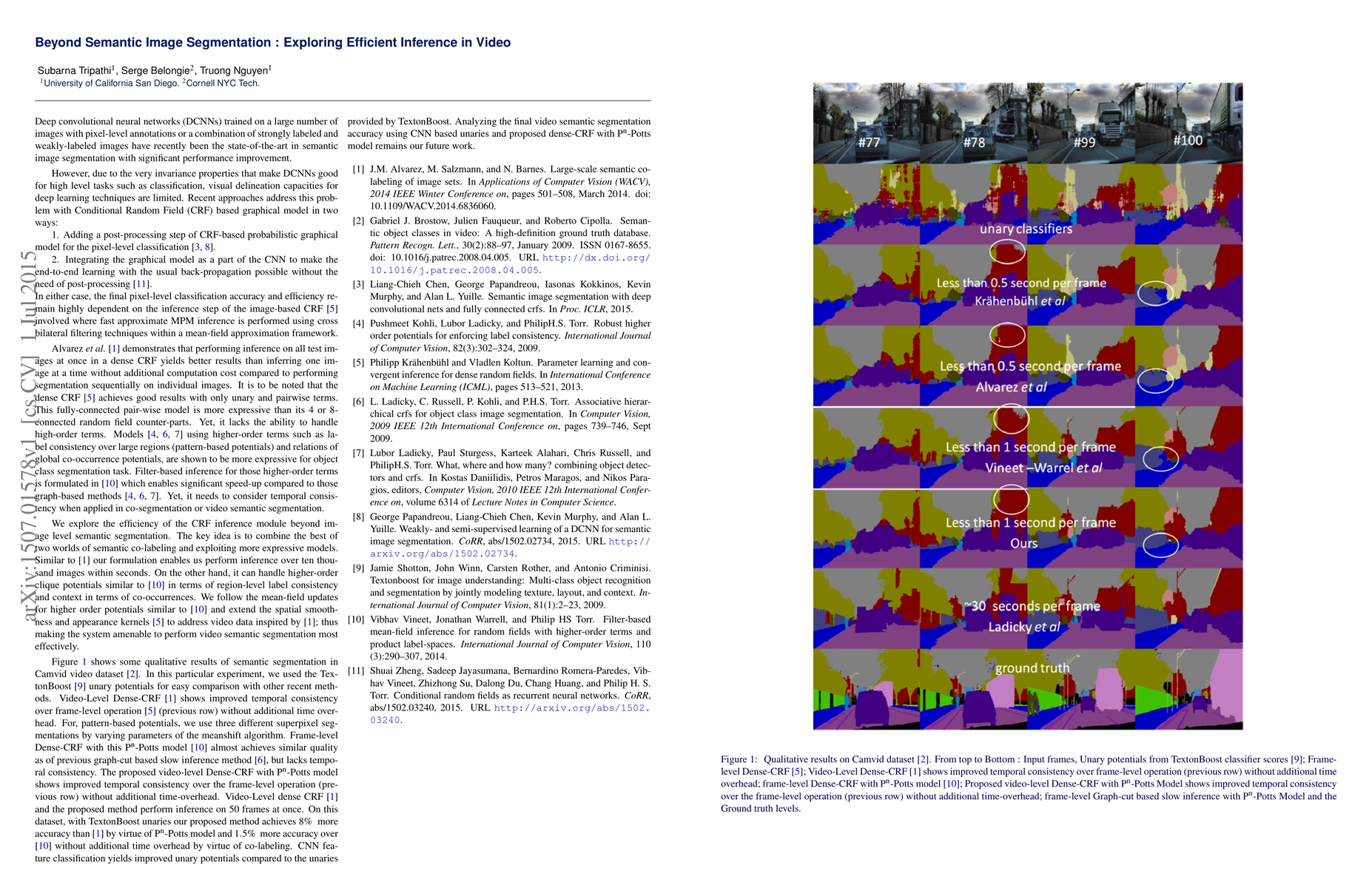This paper investigates efficient inference in video semantic segmentation by combining CRF inference with higher-order clique potentials, enabling fast processing over large datasets while maintaining region-level label consistency and context. The approach extends mean-field updates and spatial smoothness kernels to handle video data effectively.