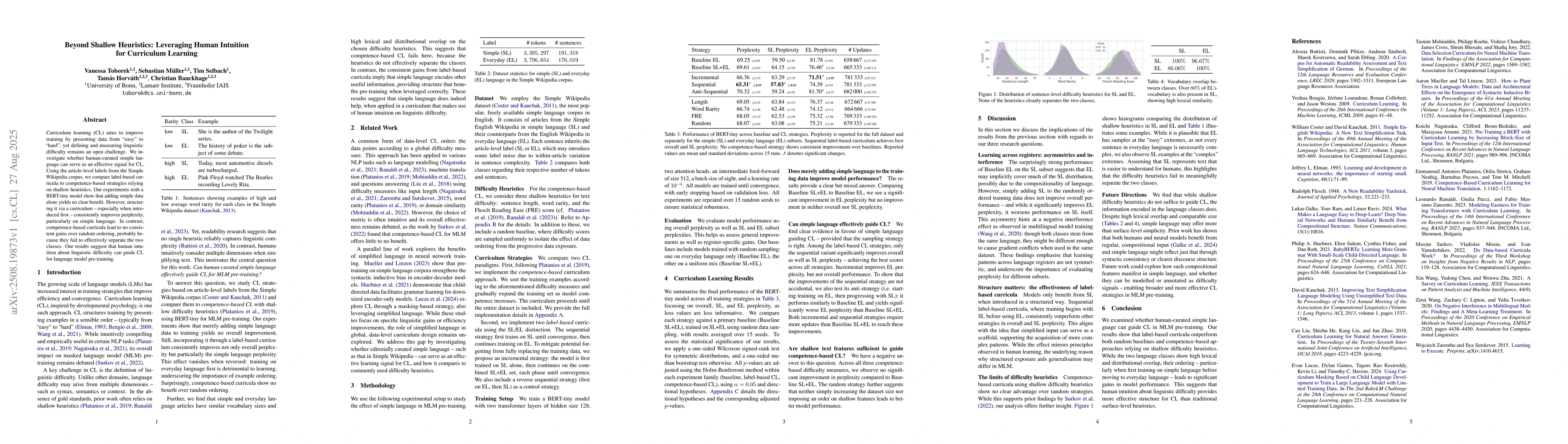 Curriculum learning (CL) aims to improve training by presenting data from "easy" to "hard", yet defining and measuring linguistic difficulty remains an open challenge. We investigate whether human-curated simple language can serve as an effective signal for CL. Using the article-level labels from the Simple Wikipedia corpus, we compare label-based curricula to competence-based strategies relying on shallow heuristics. Our experiments with a BERT-tiny model show that adding simple data alone yields no clear benefit. However, structuring it via a curriculum -- especially when introduced first -- consistently improves perplexity, particularly on simple language. In contrast, competence-based curricula lead to no consistent gains over random ordering, probably because they fail to effectively separate the two classes. Our results suggest that human intuition about linguistic difficulty can guide CL for language model pre-training.