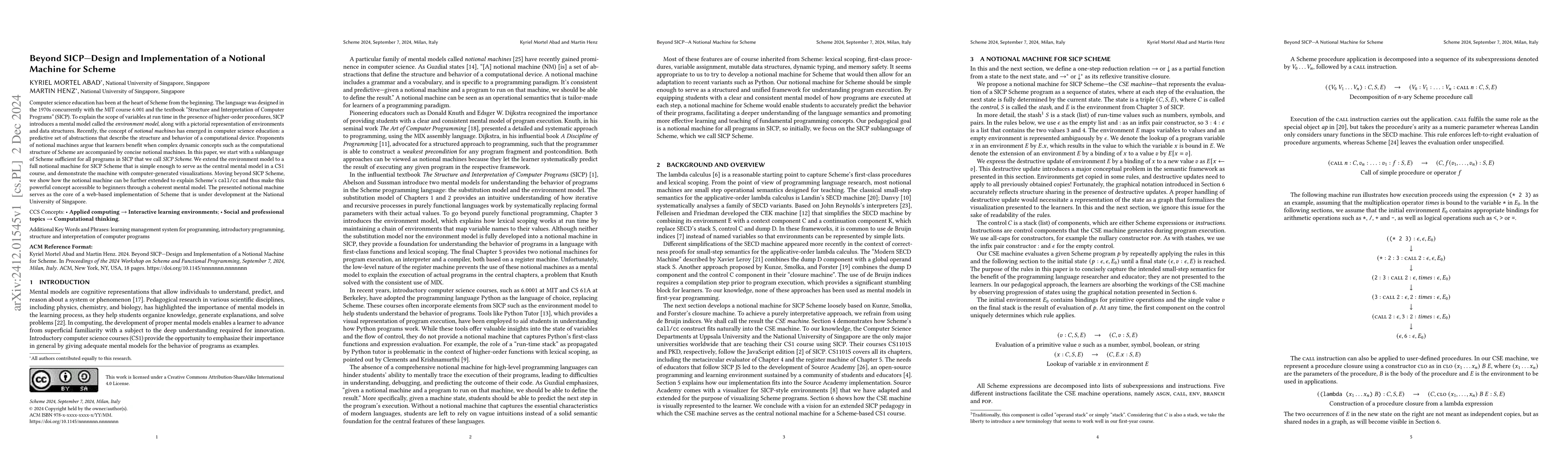 This paper proposes a notional machine for Scheme, extending the environment model to simplify the complex dynamics of Scheme, especially for novice learners. It aims to make advanced concepts like call/cc accessible through visual representations, and is part of a web-based Scheme implementation.