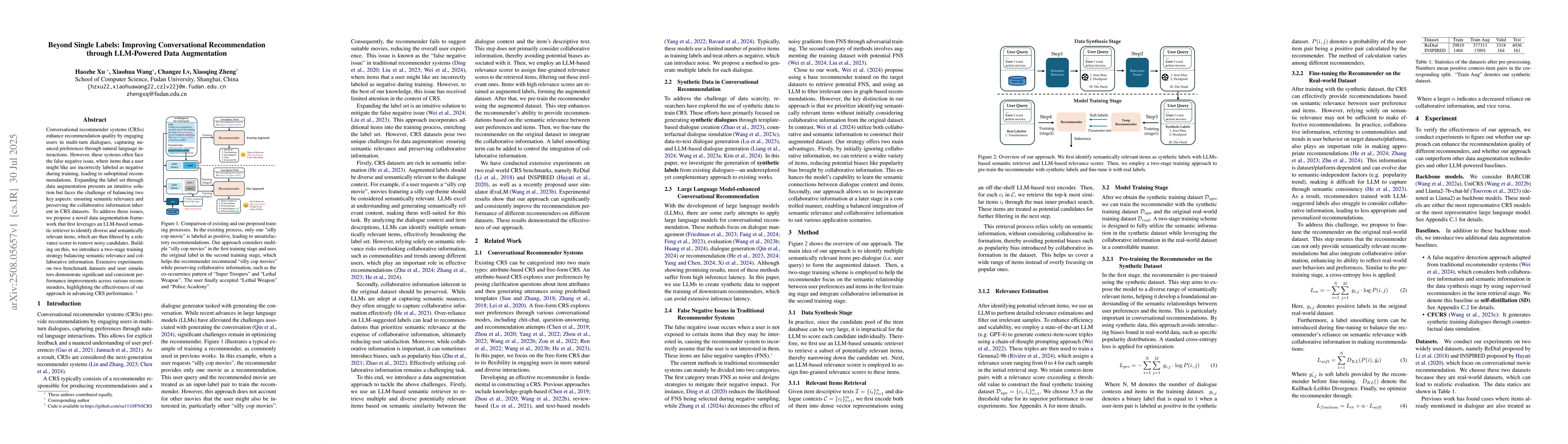 Conversational recommender systems (CRSs) enhance recommendation quality by engaging users in multi-turn dialogues, capturing nuanced preferences through natural language interactions. However, these systems often face the false negative issue, where items that a user might like are incorrectly labeled as negative during training, leading to suboptimal recommendations.Expanding the label set through data augmentation presents an intuitive solution but faces the challenge of balancing two key aspects: ensuring semantic relevance and preserving the collaborative information inherent in CRS datasets. To address these issues, we propose a novel data augmentation framework that first leverages an LLM-based semantic retriever to identify diverse and semantically relevant items, which are then filtered by a relevance scorer to remove noisy candidates. Building on this, we introduce a two-stage training strategy balancing semantic relevance and collaborative information. Extensive experiments on two benchmark datasets and user simulators demonstrate significant and consistent performance improvements across various recommenders, highlighting the effectiveness of our approach in advancing CRS performance.