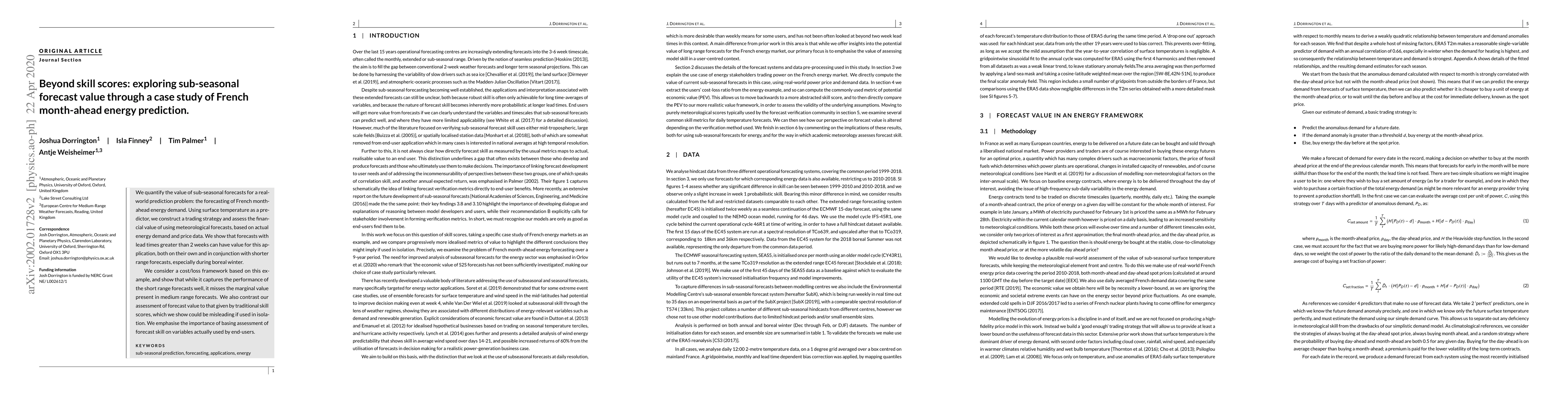 This paper evaluates the financial value of sub-seasonal forecasts for predicting French month-ahead energy demand, demonstrating that forecasts with lead times over two weeks can be beneficial, especially in winter. It highlights the limitations of traditional skill scores and underscores the importance of assessing forecast value based on actual end-user applications.