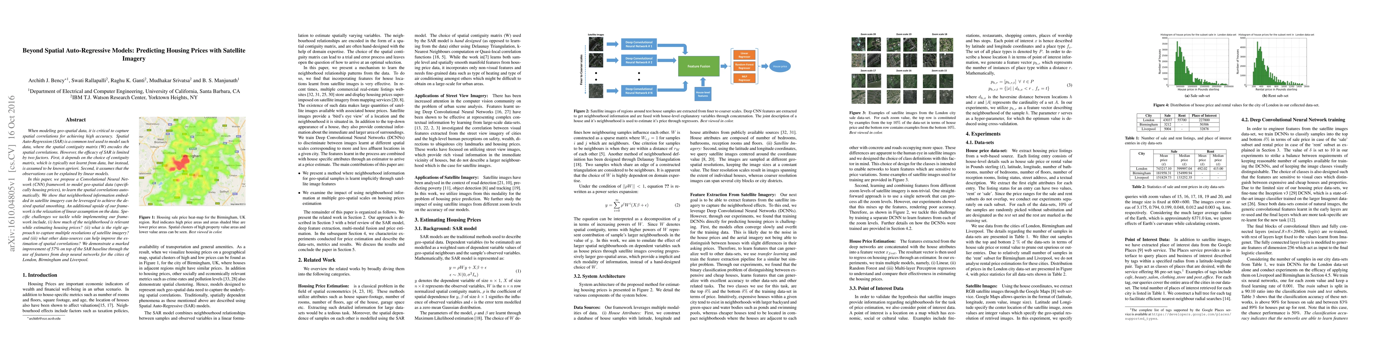 This paper proposes a Convolutional Neural Network (CNN) framework to predict housing prices using satellite imagery, addressing limitations of Spatial Auto-Regressive models by automatically learning spatial correlations and relaxing the linear assumption. The approach shows a 57% improvement over SAR baselines in cities like London, Birmingham, and Liverpool.