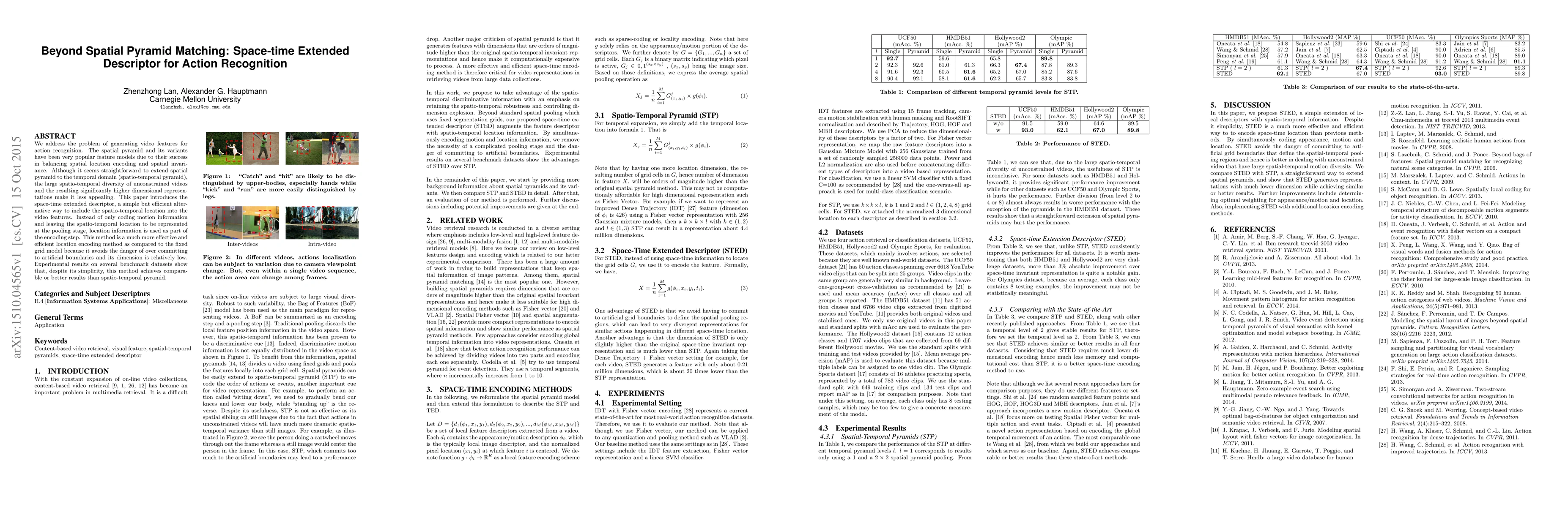 This paper proposes a space-time extended descriptor for video action recognition, offering a more efficient method than spatial pyramid matching by incorporating spatio-temporal location information into the encoding step instead of pooling stage, achieving comparable or superior performance on benchmark datasets.