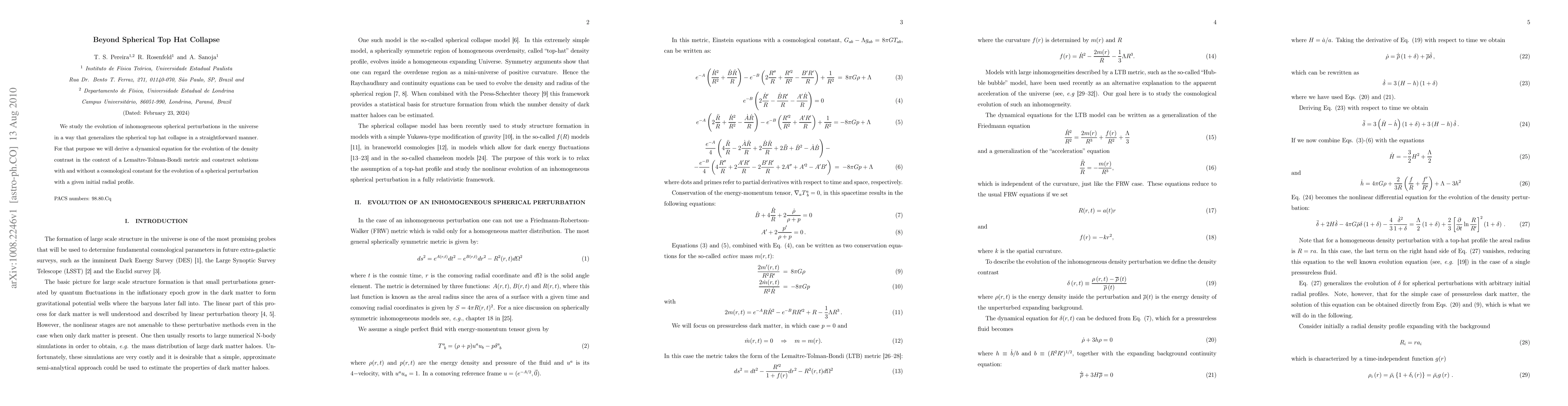 This paper generalizes the spherical top hat collapse model by deriving a dynamical equation for density contrast evolution in inhomogeneous spherical perturbations, using a Lemaitre-Tolman-Bondi metric and exploring solutions with and without a cosmological constant.
