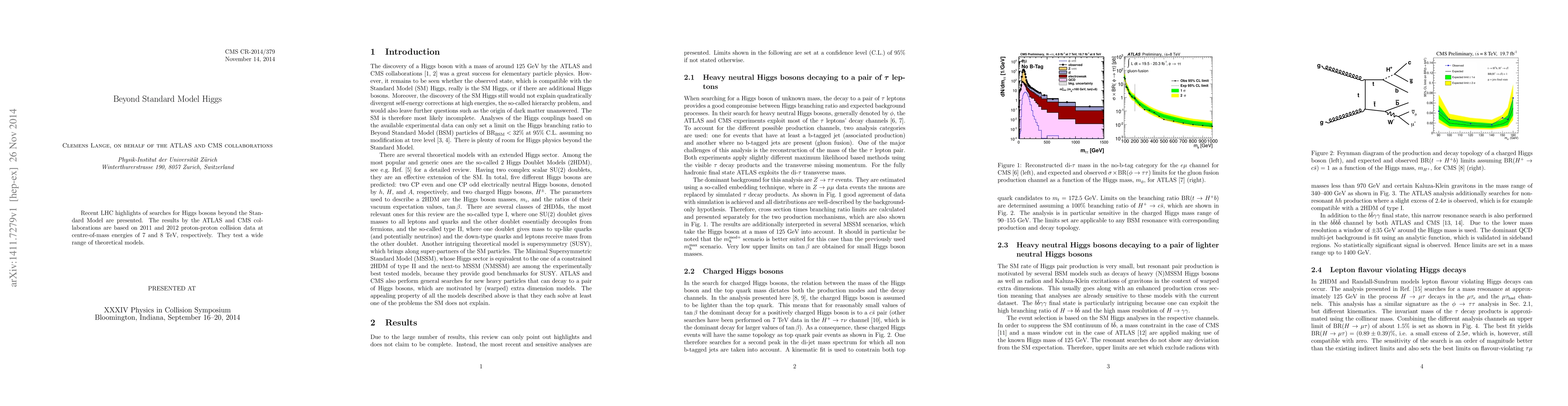 This paper summarizes recent LHC findings from ATLAS and CMS collaborations on Higgs boson searches beyond the Standard Model, utilizing data from 2011 and 2012 proton-proton collisions at 7 and 8 TeV, and testing various theoretical models. No new discoveries beyond the Standard Model Higgs were reported.