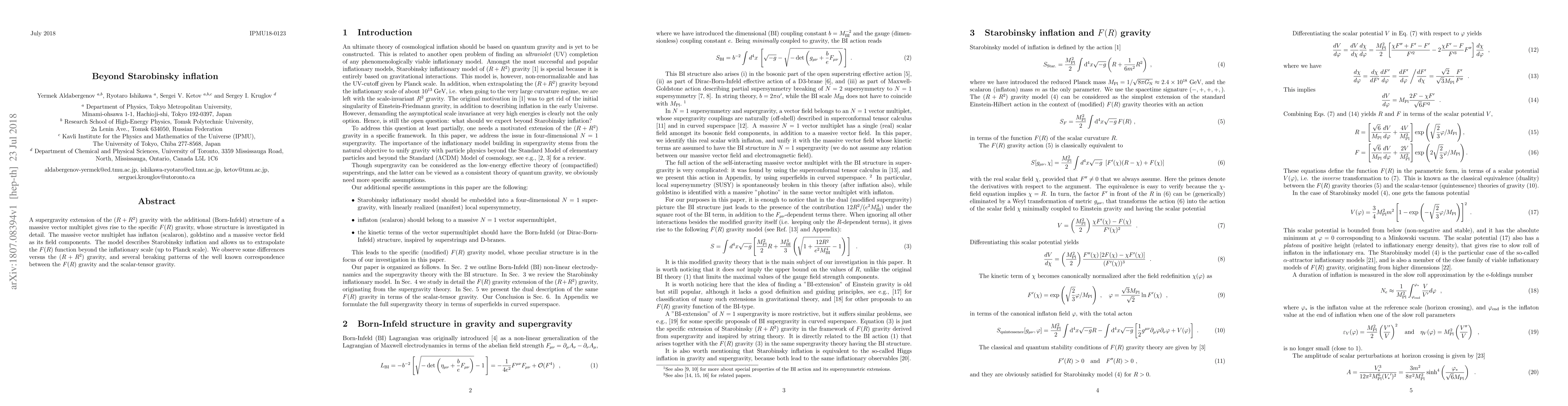 A supergravity extension of the $(R+R^2)$ gravity with the additional (Born-Infeld) structure of a massive vector multiplet gives rise to the specific $F(R)$ gravity, whose structure is investigated in detail. The massive vector multiplet has inflaton (scalaron), goldstino and a massive vector field as its field components. The model describes Starobinsky inflation and allows us to extrapolate the $F(R)$ function beyond the inflationary scale (up to Planck scale). We observe some differences versus the $(R+R^2)$ gravity, and several breaking patterns of the well known correspondence between the $F(R)$ gravity and the scalar-tensor gravity.