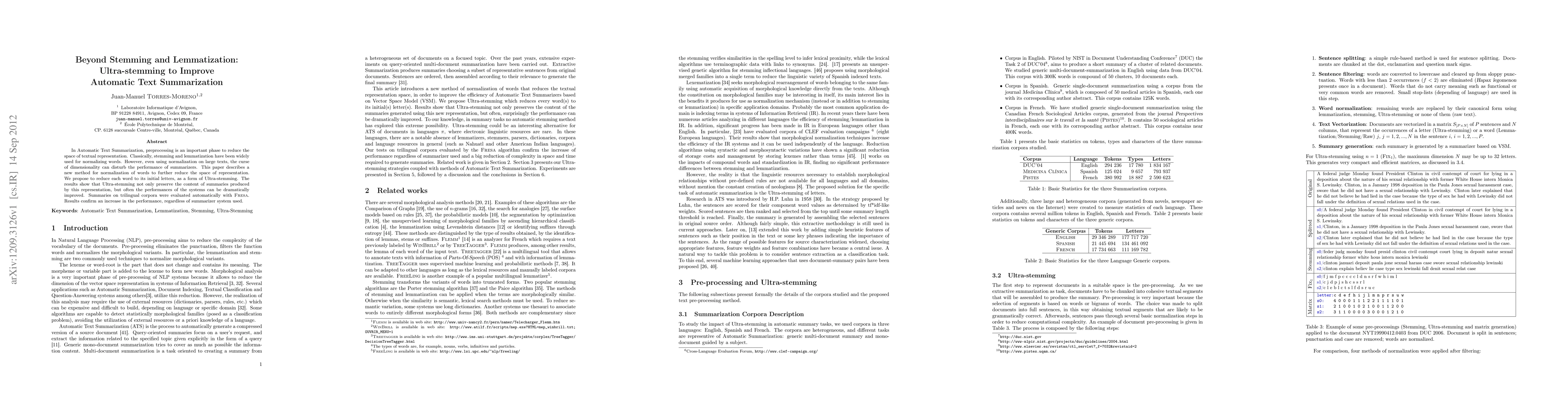 This paper introduces Ultra-stemming, a method that reduces words to their initial letters to further normalize textual representation in Automatic Text Summarization. The results show significant improvements in summarizer performance across trilingual corpora, evaluated using Fresa.