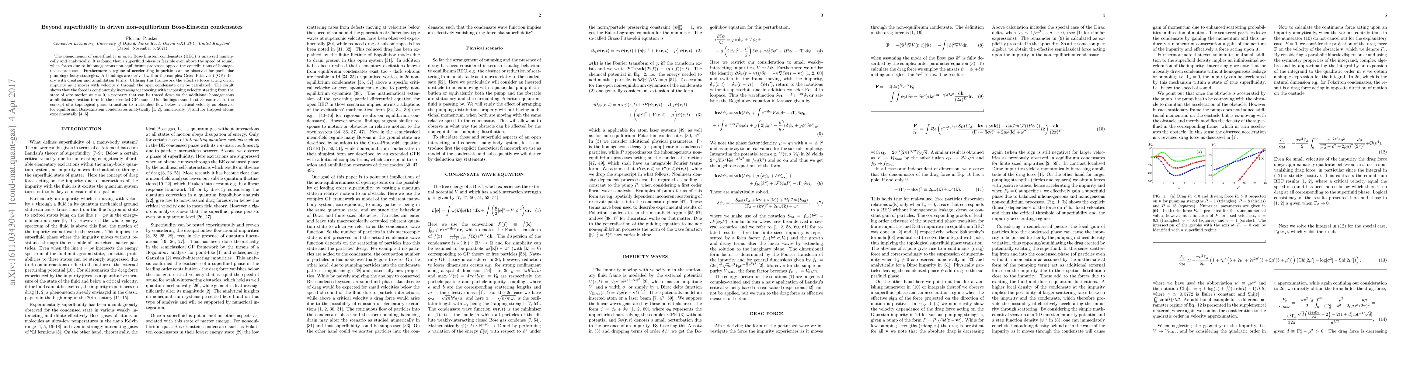The phenomenon of superfluidity in open Bose-Einstein condensates (BEC) is analysed numerically and analytically. It is found that a superfluid phase is feasible even above the speed of sound, when forces due to inhomogeneous non-equilibrium processes oppose the contributions of homogeneous processes. Furthermore a regime of accelerating impurities can be observed for particular pumping/decay strategies. All findings are derived within the complex Gross-Pitaevskii (GP) theory with creation and annihilation terms. Utilising this framework the effective force acting on an impurity as it moves with velocity v through the open condensate can be calculated. The result shows that the force is continuously increasing/decreasing with increasing velocity starting from the state of zero motion at v = 0, a property that can be traced down to the additional homogeneous annihilation/creation term in the extended GP model. Our findings stand in stark contrast to the concept of a topological phase transition to frictionless flow below a critical velocity as observed for equilibrium Bose-Einstein condensates analytically, numerically and for trapped atoms experimentally.